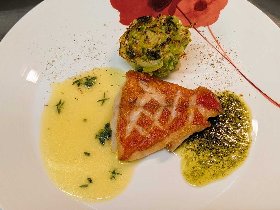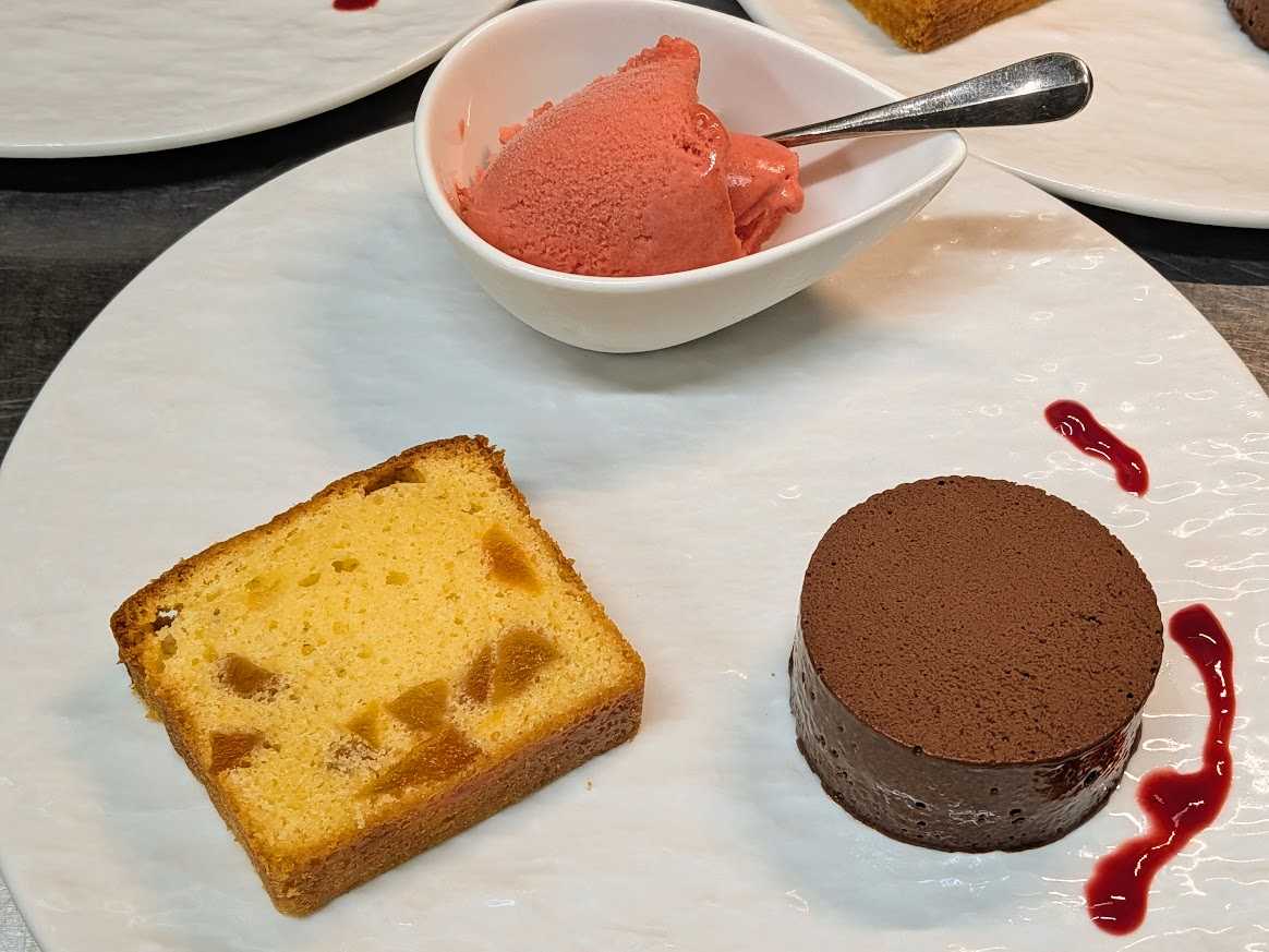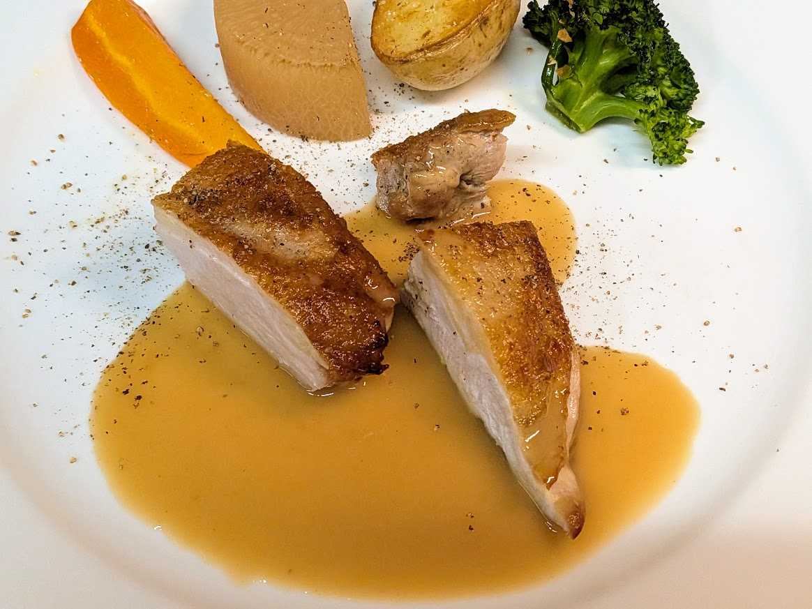 Cinq au pied,Menu Avril et Mai 2024 サンク・オ・ピエ、4月5月のコース \8800 4月7日より5月末頃まで ご予約限定コースです 3日前までにご予約ください Prosciutto KRAST BORA avec Salade スロヴェニア産生ハム、クラス・ボラ社、サラダ添え Foie gras chaud et petit risotte de petit pois de France フォアグラのソテー、フランス産青豆の小さなリゾット添え Sopupe de poissons provencaux 南仏風魚のスープ Poisson du jour poelee jus de Plourde au thym et Beurre aux Algue de mer 本日の白身魚のポワレ、タイム風味のアサリのジュとアオサノリの海藻バター Filet de Pintade poelee au vinaigre de vin de champagne 国産ホロホロ鳥の胸肉のポワレ、シャンパーニュ・ヴィネガー風味 CAKE aux avricots Sorbet de fraises Mousse au chocolat Callebaut ドライアプリコットのパウンドケーキ フランス産イチゴのソルベ ベルギー産カレボー社のチョコレートのムース Cafe de SAKAMOTO pour Menu Avril et Mai ou the , 2pains さかもとこーひーの4月5月のコースブレンド又は紅茶、2種のパン ![]() Prosciutto KRAST BORA avec Salade スロヴェニア産生ハム、クラス・ボラ社、サラダ添え 前菜のスロヴェニア産生ハムです。生ハムは薄く切るのですごい量に見えますね! ![]() まずはこうやって生ハムを客席まで持っていってお見せすようにしています。まぁ、プレゼンも味のうちですよね!これには、、、 ![]() Vermentino di Sardegna 2024 Smeralda ヴェルメンティーノ・ディ・サルディーニャ、スメラルダ 生ハムに合わせるワインは意外に難しいんですが、、、今回の生ハムの産地スロヴェニアはイタリアの隣国なので、イタリア、サルディーニャのワインです。ヴェルメンティーノ種100%、若い辛口でブドウの香りとミネラル感、微かな塩分とほんのり感じる苦みが、生ハムを引き立てますね! ![]() Foie gras chaud et petit risotte de petit pois de France フォアグラのソテー、フランス産青豆の小さなリゾット添え 温前菜です。フランス産の小粒のグリーンピースは甘味があって美味いです。リゾットにするとフォアグラとの相性もばっちりですよ!バルサミコのクリームソースも良い組み合わせです。これには、、、 ![]() Brachetto d’Acqui 2024 Mario Trelli ブラケット・ダックィ、マリオ・トレッリ こちらは、イタリア、トスカーナの甘口赤(ロゼ?)ワインです。透明感ある淡い色の赤ワインで、微かに炭酸を感じる微発泡です。アルコール度数も5%と低めで飲みやすいタイプです。熟したブドウの香り、かすかにスミレも、優しい味わいが青豆のリゾットにもフォアグラとバルサミコクリームにもよく合います! ![]() Sopupe de poissons provencaux 南仏風魚のスープ ブイヤベースのスープという感じです。 実はこれ、本場南仏プロヴァンス風とは全く違う料理なんです。本場のものは、白身の小魚を内蔵ごとつぶして作って、ニンニクやハーブで臭みを殴り倒すというようなかなりワイルドな漁師料理でなかなか食べずらいのです。私の場合、和食の粗汁のように魚の綺麗な味わいだけを抽出した感じです。多分日本人ならみんな好きな感じですよ!この画像のスープは、真鯛、平目、金目鯛、ソイ他6種類の魚を使いました。美味いですよ! ![]() Poisson du jour poelee jus de Plourde au thym et Beurre aux Algue de mer 本日の白身魚のポワレ、タイム風味のアサリのジュとアオサノリの海藻バター 魚料理です。春が旬のアサリの出汁を使ったソースは庭のタイムを使ってシチリア島の特上オリーヴオイル(プラネタ)で仕上げています。もう一つは春取りの香りのよいアオサ海苔を細かい粉末にしてバターと合わせた海藻バターを使ってます。 画像は、千葉県の勝浦の金目鯛です。タイムの香りとアオサ海苔の香りがなんとも良い感じですよ! スープと魚料理には、、、 ![]() Cassis Blanc 2022 Dmeaine de la Ferme Blanche カシー・ブラン、ドメーヌ・ド・ラ・フェルム・ブランシュ 魚のスープと魚料理に合わせるワインです。南仏プロヴァンスの辛口白ワインです。 ブイヤベース味の魚のスープには地元でも定番のワイン、5種類の白ブドウのミックス。石灰質土壌の畑のため、しっかりミネラル感があり、良く陽にあたって熟した果実味とバランス良い酸味が、魚料理のアサリの旨味や海藻バターのミネラルにもよく合いますね!一つのワインで違った面のマリアージュも楽しみです。 ![]() Filet de Pintade poelee au vinaigre de vin de champagne 国産ホロホロ鳥の胸肉のポワレ、シャンパーニュ・ヴィネガー風味 ![]() ホロホロ鳥の肉の断面をクローズアップで、、。ほんのりピンク色でしっとり仕上がっているでしょ? 鶏は上手に焼くと胸肉のほうがモモ肉より上品で美味いと思います。肉を焼いた鍋をシャンパーニュ・ヴィネガーでデグラセ(鍋に着いた旨味を溶かす)して、そこに鶏とホロホロ鳥の出し汁を加えてソースを仕上げます。もとより、鶏とヴィネガーの相性は最高です。高級ワインのシャンパーニュをヴィネガーにしたのだから、けっこうお高いお酢なんです。ちなみに国産のホロホロ鳥もけっこう高価なんですよ。これには、、、 ![]() Alsace Pino
