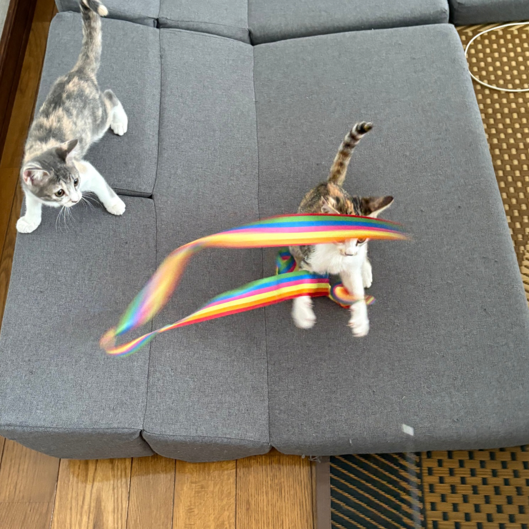新米主婦のみのりです! 今回は、以前の投稿で姉にデブ猫やな...と言われてしまったのでつむぎさんのダイエットを決意。 姉宅にもわがままボディの猫ちゃん(つむぎより運動神経はある)がこれなら遊ぶと言われたので、さっそく買ってきました。 この子は遊び始めてもすぐに横になって手だけで遊んでしまう子でつむぎさんと遊び方がそっくりです笑 その製品がこちら ![]() 「じゃれ猫リボンの舞」 ■素材 竿:グラスファイバー、EVA、ステンレス、ゴム リボン:ポリエステル、スチール 遊んでみてメリット・デメリットをご紹介します。 ★メリット 取っ手部分をつかむとグリップが効いていて、つむぎさんのような7キロオーバー猫ちゃんと遊んでも力で負けず持ってかれません。 「新体操のリボンみたいにすごく扱いやすいおもちゃで、狙ったところにブンブンしやすいから猫もすごい勢いで遊んでくれます。」 上下どちらの運動も可能。 リボンの丈夫さがいいと思います。適切に使用すれば、長期間使用できます。 破損しにくい構造なので、何度も使用しても比較的耐久性が高いです。 ※つむぎさんは、とてもどんくさいのですが力はあるのでおもちゃ捕まえたらすぐに壊してしまいますがこれは大丈夫でした。 ★デメリット リボンが長いため、遊んでいるちに絡まりやすいのが難点です。 多頭飼いのため、一気におもちゃに飛びついてきます。 短時間で複数の猫ちゃんたちと同時にあそべて就業前の忙しい時間等に重宝できますが、毎回玉結びになって絡まります 次にうちの猫ちゃんたちの反応です。 ■つむぎの場合 つむぎさんは鳥が好きなので、上部でクルクル回してあげると少し反応していました。 床に這わせるように蛇のようにくねくねさせるとうまく追えていませんでした。笑 ■結果 全然追えていないため要練習が必要。笑 ![]() ![]() 続いてぷるとかるです。 ■ぷるとかるの場合 ぷるとかるは、上の動きも下の動きもどちらも動けていました。 さすが子猫ですね。どんな動きでも遊んでくれます。 ですが、 2匹同時に飛びついてくるとリボンが絡まってほどくのが大変です(*´ロ`*) ![]() ![]() ![]() 絡まっている状態 ↓ ![]() 使用して一週間経ちましたがこの状態。 とてもいい!朝昼晩と酷使しても、さんにゃんずの攻撃に耐えてくれます。 ■結果 使用すると、玉結びになってしまってほどくのが少し面倒ですが耐久性にすぐれています 馬力のあるオス猫ちゃんでもすぐ壊すことなくコスパよく使えそう 以外とリボンは思ったように動きます。 ぷるとかるは問題なく使用できたが つむぎさんは、リボンを追うことができないため要練習が必要 つむぎさんの反応はイマイチでダイエットは前途多難ですが、このおもちゃコスパ良くてよかったです。 今後も使っていきたいと思います。 ◇ドギーマンハヤシ じゃれ猫りぼんの舞 では、また新しいおもちゃを手に入れてみた結果を投稿したいと思います。 つむぎさんの野生をいつか取り戻せるまで...( ;ᵕ; ) 応援してくれると嬉しいです! ではここまで閲覧頂きありがとうございます! また次回の更新でお会いできることを楽しみにしておりますペコリ(o_ _)o)) お気に入りの記事を「いいね!」で応援しよう