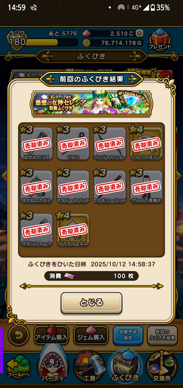 ![]() ドラクエウォーク! ドラゴンクエストウォーク! 慈愛の女神セレシア装備ふくびき! ちょっと期待したけど! ☆5装備なし! 10連×193回=1930連で、☆5装備は、132個! ☆5装備出現率は、6.8393782%! またまたガッカリだよ! もう、3個以上、足りなくなってきた! 次回、4個でないと、いや、4個以上出たら、7%以上になる! そいつぁよかった! ドラゴンクエストウォーク 公式ファンブック 5th Anniversary [ スクウェア・エニックス ] お気に入りの記事を「いいね!」で応援しよう