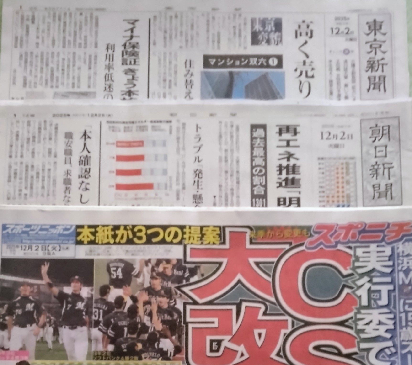 ![]() 新聞試し読み! 朝日新聞、12日目! 1面トップは、再エネ推進「明文化」74%! 再エネとは、再生可能エネルギーのことで、太陽光発電や風力発電などのこと! それを明文化して推進する自治体が、過去最高の74%になったとのこと! ああ、こうやって書いてると、昔『気まぐれ刊 今日の数字』というメールマガジンを発行していたことを思い出すなぁ! リチウムって、金属の中で一番軽いんだ! 知らなかったなぁ! 勉強になります! 全24ページ! スポーツニッポン、5日目! 1面トップは、プロ野球、CS改革の記事! CSとは、クライマックス・シリーズの略! セパ両リーグで、3位までのチームが勝ち抜き戦を行い、勝ったチームが日本シリーズに進出するという制度! 今年、大谷翔平ドジャースの、米大リーグのポストシーズンを観ていると、ワールドシリーズまでの道のりが、長く険しく、更にワールドシリーズまで、非常に楽しんだ! たぶん、それを真似して、2007年に始まった制度だと思うけど、やっぱり球団数が、圧倒的に少な過ぎる! 米大リーグは、ア・リーグ、ナ・リーグと、2リーグ制で、リーグ数は日本も同じだが、それぞれのリーグの中に、東部・中部・西部の3地区があり、それぞれの地区に、5チームの球団が属している! 全部で30チームがあり、地区優勝6チームと、ワイルドカード、何チームだっけ?もう覚えてないけど、とにかくたくさんのチームがあって、レギュラーシーズンを戦った後に、ワールドシリーズチャンピオンを目指す1カ月に及ぶポストシーズンがあるのは、面白いし、地区優勝できなくても、他の地区の優勝チームより勝率の良かったチームにチャンスを与えるという、説得力もある! しかし、日本のプロ野球は、セパ6チームずつで、その上位3チームが日本シリーズ進出をかけてCSを戦うというのは、説得力がなく、なんかショボい! リーグ優勝チーム同士の日本シリーズで、いいじゃん、と思う! そんな人が多いからこその、CS改革なのかなと思うが、スポニチが3つの提案を載せているけど、3つ目の提案が一番オイラ的にはいいかな、と思う! チーム数を増やせないならば、いっそのこと、昔パリーグがやっていた、前後期制を取り入れたらどうか? チーム数そのままで、日本シリーズ進出可能チーム数を2倍に広げられる? 前期優勝チーム、後期優勝チーム、前期後期での2位以下の勝率上位チーム、重複もあるけど、最大4チームで、……! ややこし過ぎるし、半数以上の4チームが対象になるのはちょっとやり過ぎか! ま、やっぱ、米大リーグのように、チーム数を増やすのが一番いいと思うけど、難しいんだろうなあ! そんなことより! 『のたり松太郎』が、付録のように付いてた! オイラの大好きな漫画、だけど、なかなか手に入らない! 今、オイラの手元に残っているのは、コミックスの2冊だけ! 全部集めようとして集まらなくて、引っ越しなんかで処分しちゃって、結局ビッグコミックスの23巻と24巻だけが残っている! 52号だけど、全20ページで、マンが本文は74ページ分掲載されている! 単行本1冊の、3分の1ぐらいか! だから、52号で、単行本の14巻ぐらいまでの感じだね?! まだ、まげの結えない、十両時代の松太郎、読んだ記憶のある内容だ! 松太郎が読めるのなら、ちょっとだけ購読したい気持ちが起きた! 所どころのセリフが、フォントが違っているので、たぶん元のセリフと差し替えてるんだろうなあ、元のセリフは何だったんだろう、と、気になってしまう! 全18ページ、のたり松太郎は、ハーフサイズの20ページ! 東京新聞、5日目! 1面トップは、東京のマンションの価格高騰の記事! 買ったマンションが、数年後には数倍の価値になり、それを売って、より都心に近く高価なマンションを買う、また数年後に、というのを繰り返す、という話! バブル期と同じことがまた起きてるんだなぁ! 全20ページ! そいつぁよかった! 球辞苑 ~プロ野球が100倍楽しくなるキーワード辞典~ [ NHK「球辞苑~プロ野球が100倍楽しくなるキーワードたち~」制作班 ] お気に入りの記事を「いいね!」で応援しよう