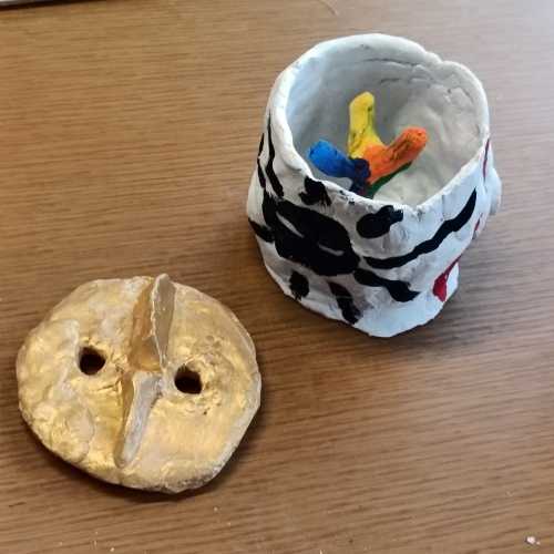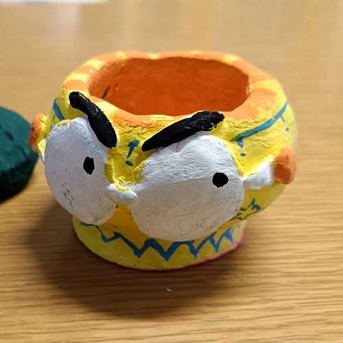 重量感のある紙粘土を使って壺を作っています。ジェッソで下塗りしてからアクリル絵の具で着色しています。