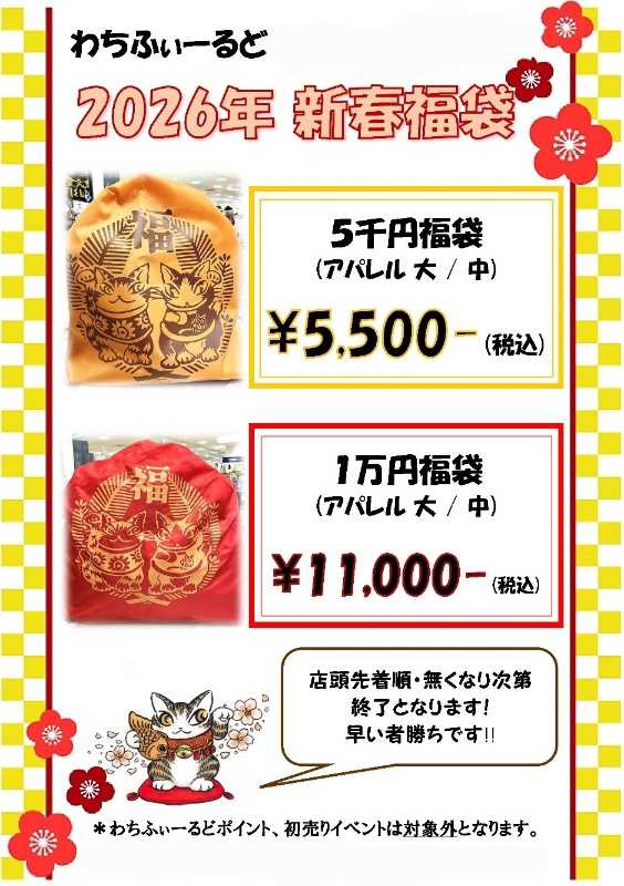 福袋の店頭販売あります 税込5,500円/11,000円 各中、大
