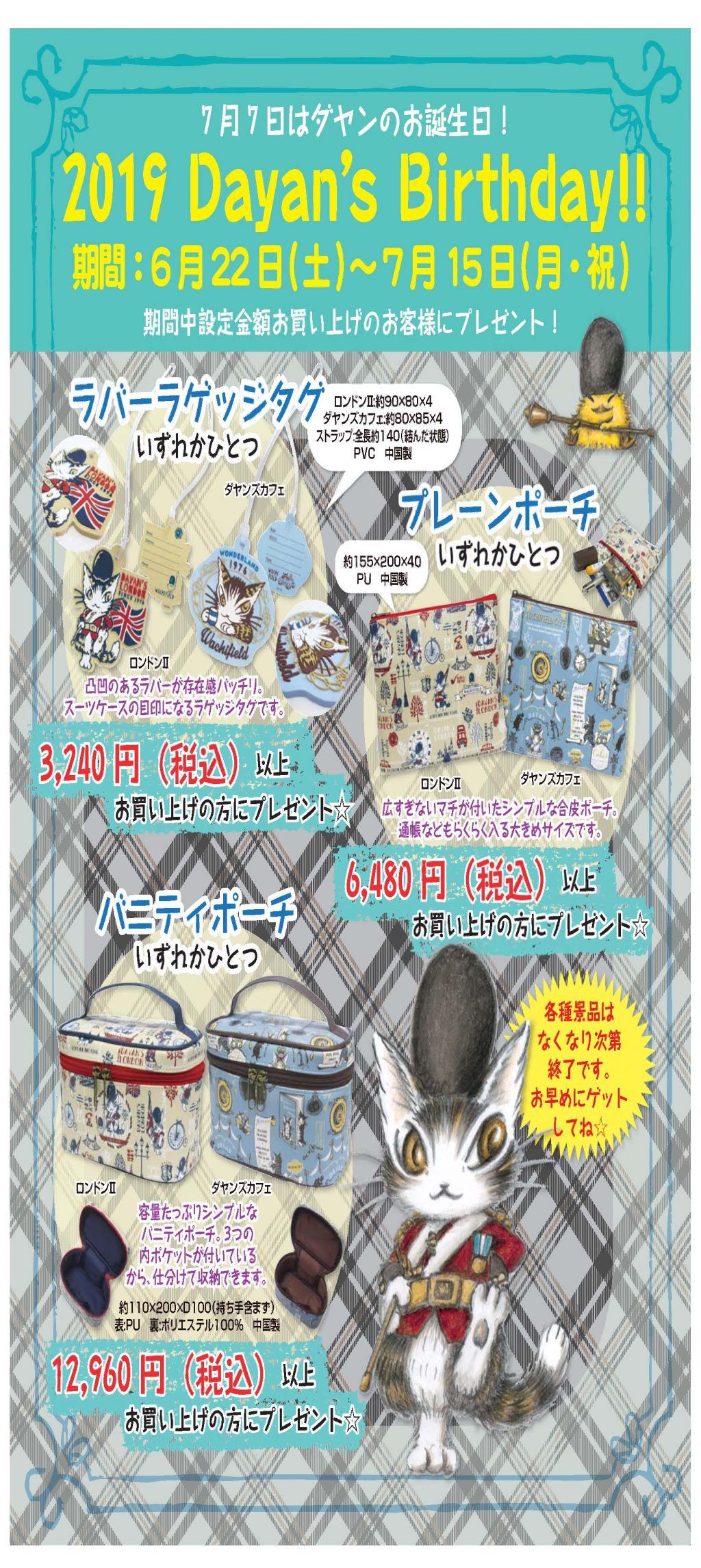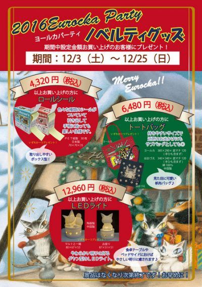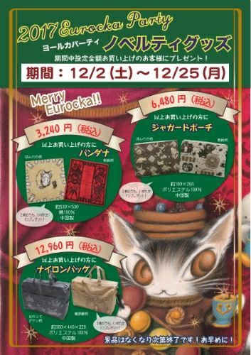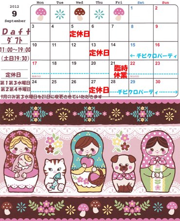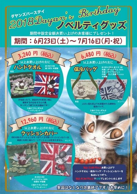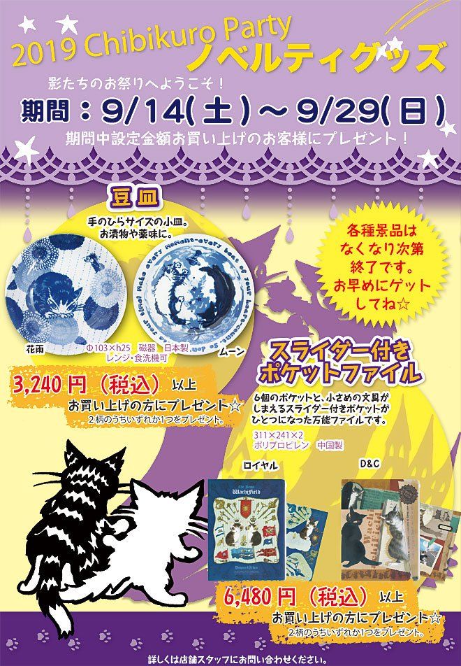 〇チビクロパーティ開催のお知らせ9月15日(土)~9月30日(日) チビクロパーティとは、ダヤンの影「チップ」が登場する物語で影達のお祭りの事。たくさんの影たちが浮かれて躍りだす、年に一度のお祭りを記念して、お店でもすてきなプレゼントをご用意しました。 3,240円(税込)以上で「ファスナーポーチ(全2種)」を1つ6,480円(税込)以上で「小鉢(全2種)」を1つそして35周年の今年は特別にもう1種類ご用意しました!10,800円(税込)以上で「マルチポーチ(全2種)」を1つプレゼント致します。☆20,520円(税込)以上で各種1点、41,040円(税込)以上で全種プレゼントいたします♪※プレゼントは数に限りがございますので、なくなり次第終了とさせていただきます。 カレンダー、スケジュール帳揃いました\(^-^)/ 問い合わせの多かったブック型アイフォンケースと2ポートACアダブター入荷しました お取り置き、承ります❗お気軽にご連絡くださいませ ご来店をお待ちしております ※定休日は水曜日ですご迷惑をおかけしますが、よろしくお願いいたしますドラマの最終回が楽しみなこの時期、『探偵が早すぎる』にハマって楽しく見ていました🎵会えなくなるのが寂しいダフト店長菊地です