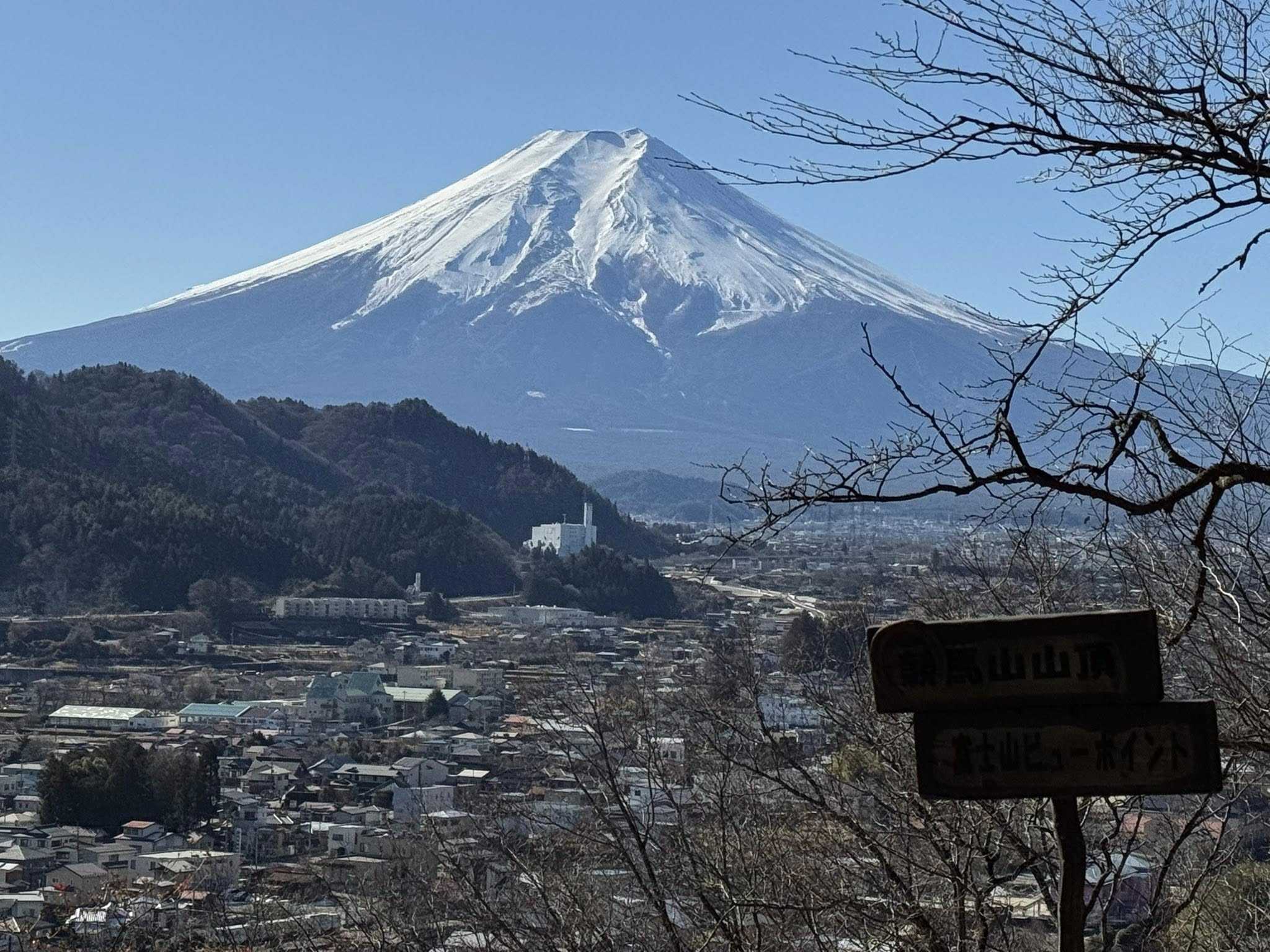 山梨県西桂町にある「競馬山(けいばやま)」に登ってきました。 競馬山は明治時代、山頂を回るコースで競馬が行われたと伝えられ、地元有志の「競馬山桜の会」が遊歩道や山頂の整備を行いました。 山頂からは富士山と西桂の街並みが一望でき、気軽に散策が楽しめます。 競馬山山頂の「幸せの鐘」 ![]() 登山口から山頂まで徒歩で約15分のルートです。 ![]() 「山頂に二つの祠が祀られている。この内、一つはおしら神さ ん(養蚕の神様)後方の祠は丸子神社の分社が祀られている。 この祠を取り巻くように細長く平坦にされたところがあり、 ここでかつて競馬が行われていたといわれている。競馬山の名 もそこからきているという。 日本競馬会の草分けといわれる槇田吉一郎氏によって作られ 明治末期に盛んに競馬が行われたと伝えられている。」 西桂町歴史散歩より ![]() 寄りそって咲く「縁結びの恋人桜」 ![]() 山頂からの富士山と西桂の街並み ![]() 富士山麓電気鉄道富士急行線・三つ峠駅:三ツ峠山への登山口です。 ![]() 三つ峠駅周辺からの三ツ峠山(1785m) ![]() 西桂町役場新庁舎:国立競技場を設計した世界的な建築家・隈研吾氏の設計です。