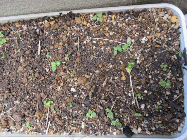 ストックは8月中旬に蒔きましたが、 暑さで枯れるのが多く、 15本ほどしか残らなかったので、 更に 8月下旬に 2度目を 蒔きました。 大きく育っているのは 8月中旬のストックです。 2回目に蒔いたのは 双葉の苗もあります。 ![]() ビオラの種は大量にあったので、 あちらこちらに 並べています。 大きくなったのだけ、 2階のプランターに置いています。 ![]() 雲南桜草は こぼれで 大きなプランター2カ所から 発芽してます。 ![]() 早く植え替えた方が大きくなります。 ![]() 早く こぼれに気が付いた 雲南桜草は 早く ポットに植えこんだので、 大きく育っています。 5~6ポットが 大きく育っています。 ![]() 昔 育てたことがあるので、 プリムラマラコイデスも 発芽してます。 白かピンク どちらかな? ![]()