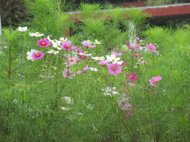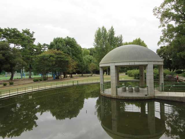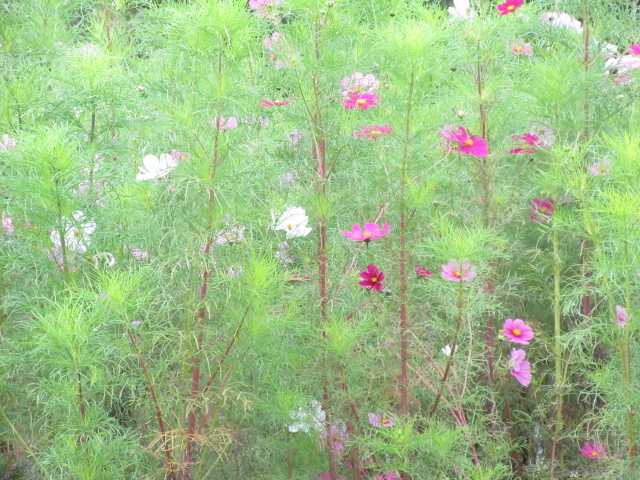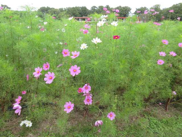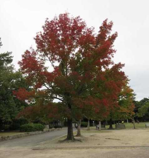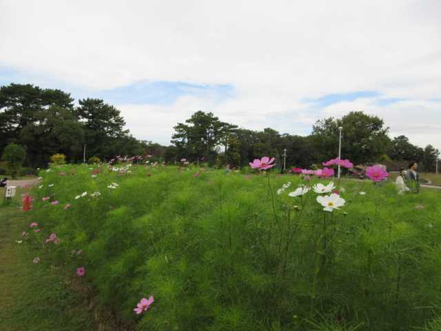 服部緑地公園の入り口です。 広い公園の入り口を 歩きだしました。 紅葉してる木々が 美しかったです。 広い敷地です。 人に会う事も 殆どないです。 コスモスが 円形花壇の上から 見えました。 階段を下りて 順番に見ました。