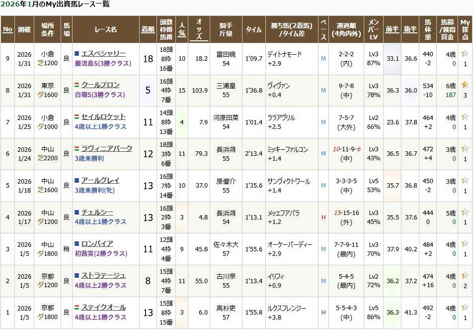 1月は9頭で9走でした。 この1月は一口馬主を開始して以来、文句なしぶっちぎりで最低の月でした。 12月まで続いていた連続勝利は7か月で途絶え、昨年は年間で3週しかなかった出走が無い週が早くも2週目で現れ、連続出走も14週で止まりました。 内容は更に悪く9走中シンガリ負け含めて7走が二桁着順、掲示板は5着が1回のみともう1月終了時点で年始に挙げた掲示板率等の数値目標の達成はほぼ無理になりました。 今後これよりひどい月が無いよう祈りたいです。 1月の成績です。 ![]() 2月は現在のところ2週目以降出走予定が皆無なので2月も厳しい月になりそうです。 ランキング参加中!クリックお願い致しますm(_ _)m 一口馬主ランキング お気に入りの記事を「いいね!」で応援しよう