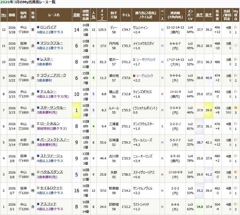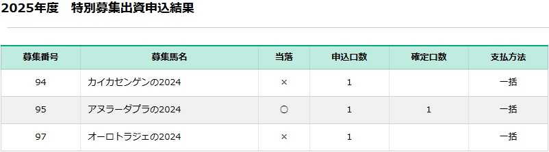 3/23にキャロットの再募集/特別募集が発表されました。今回から追加募集から特別募集と名称が変わったようです。4/1の詳細発表が出てから記事にしようかとも思ったのですが、ネタもないのでとりあえず書きました。昨年が高額馬ばかりで自分の許容金額以内の募集馬がレイデオロ産駒の牝馬しかいなかった時点で出資は諦めていた状況でした。まあ去年は本募集で4頭出資が決まっていたと言うのもあって無理してまで申し込む必要が無かったのですが。去年の事を考えると今年も高いのだろうなとは思っていましたが予想通りでした。去年ほどの高額馬はいませんが最低募集価格は去年と同じ4000万です。正直厳しいですが、今年は出資馬が2頭しかおらず、その2頭も既に頓挫してデビューはかなり遅くなるのが確定しています。そういう状況なので最低1頭出来れば2頭欲しい所ですが、金額的にも厳しい上にそもそも追加募集は出資申し込んでも当選確率は極めて低いです。去年こそ申し込みませんでしたが、今までかなりの頭数申し込んでいて当選したのは人気が低そうだった2頭のみです。レーベンスティールやセントメモリーズも申し込んでいたんですけどね。それを考えると1頭増やす事すら厳しいのが現状でしょう。今回の募集馬は再募集1頭に特別募集6頭です。その内特別募集の1頭は地方馬なので考慮外とすると実質5頭です。募集馬は以下の通りです。No.9 サンクテュエールの24 サートゥルナーリア (ディープインパクト) メス 黒鹿 1月14日 NF空港 鹿戸雄一厩舎 6,000万円 150,000円No.94 カイカセンゲンの24 ナダル (ネオユニヴァース) 牡 鹿 4月4日 NF空港 武井亮厩舎 4,400万円 110,000円No.95 アヌラーダプラの24 モーリス (キングカメハメハ) メス 黒鹿 2月28日 NF空港 萩原清厩舎 4,000万円 100,000円No.96 レイパパレの24 サートゥルナーリア (ディープインパクト) 牡 栗 3月21日 NF早来 高野友和厩舎 6,000万円 150,000円No.97 オーロトラジェの24 サリオス (オルフェーヴル) 牡 栗 4月2日 NF早来 石坂公一厩舎 5,000万円 125,000円No.98 (外)ドラムガールの24 McKinzie (English Channel) 牡 鹿 3月3日 NF空港 高橋一哉厩舎 6,600万円 165,000円高額馬は気にはなりますが、いくら出資馬が少ないとは言え流石に追加募集枠で6000万以上出す気にはなれないです。なのでそれぞれの馬に対するコメントを。再募集の1頭は事前にそれなりの人気があったサンクテュエールの24ですが、やはり骨折での募集取り消しを考えるとかなり怖いですね。ただ再募集している時点でとりあえず骨折はしっかり治ったのでしょうし、育成の進み具合と馬体次第でしょう。レイパパレの24は父サートゥルナーリアで正にキャロットの結晶の塊の様な血統です。本来なら当然本募集の目玉になるような馬でしょうが、ここに出てきたという事は既に色々な所で言われている様に成長と育成に問題があったのでしょう。ただ父サートゥルナーリアのレイパパレの牡馬でこの募集価格は昨今の他の馬の募集価格からするとかなり安いので将来的な成長に期待して出資するかでしょう。この時点で400kg以下だとなかなか厳しそうですが、人気にはなりそうです。そして〇外のドラムガールの24です。今回の最高募集価格です。外国産馬は賞金面や下級条件でのレース制限があるのでその点では厳しいですが、牡馬については出来が良ければ大物の可能性もと思ってしまいます。多分馬の出来だけならこの馬が一番良いのではないでしょうか。通常募集時ですと基本4000万までなのですが、そうなると候補は1頭だけになってしまうので今回は5000万までの馬は候補に入れたいと思います。募集番号順にまずカイカセンゲンの24。ナダルの牡馬で母も完全なダート馬。初仔なのが心配ですが馬体さえ良ければナダル産駒の勝ち上がり率は高いので期待したい所です。ただ自分のナダル産駒のステイクオールは勝ち上がったものの、その後はいまいちなのでその不安はあります。そしてこの馬からは叔母に当たる出資馬のペタルズダンスは兄弟馬で唯一勝ち上がっていないので自分との相性が悪そうなのが何とも言えないです。募集価格も高いですしね。アヌラーダプラの24は募集価格的には唯一許容範囲の馬です。ただこちらも追加募集のモーリス産駒牝馬はデリツィオーサで痛い目見たので不安です。萩原清厩舎もラヴィニアパークが勝ち上がれていないし、レース選択や使い方にも不満が残るだけに難しいです。血統だけ見ると5000万するとは言え一番ありなのがオーロトラジェの24でしょうか。ショウヘイの半弟ですし、レイデオロ産駒の半兄も勝ち上がっています。サリオス産駒がまだ分からないものの期待は出来ますし。ただ、半兄はセレクトセールに出したからキャロットに来たものの、ショウヘイが活躍した後のこの馬がサンデーでなくキャロットに回ってきたことが怪しいですね。出来が良ければ普通にサンデーで募集されそうですし。4/1に動画を含めた詳細が発表されるので結局の所はそれを見てからで