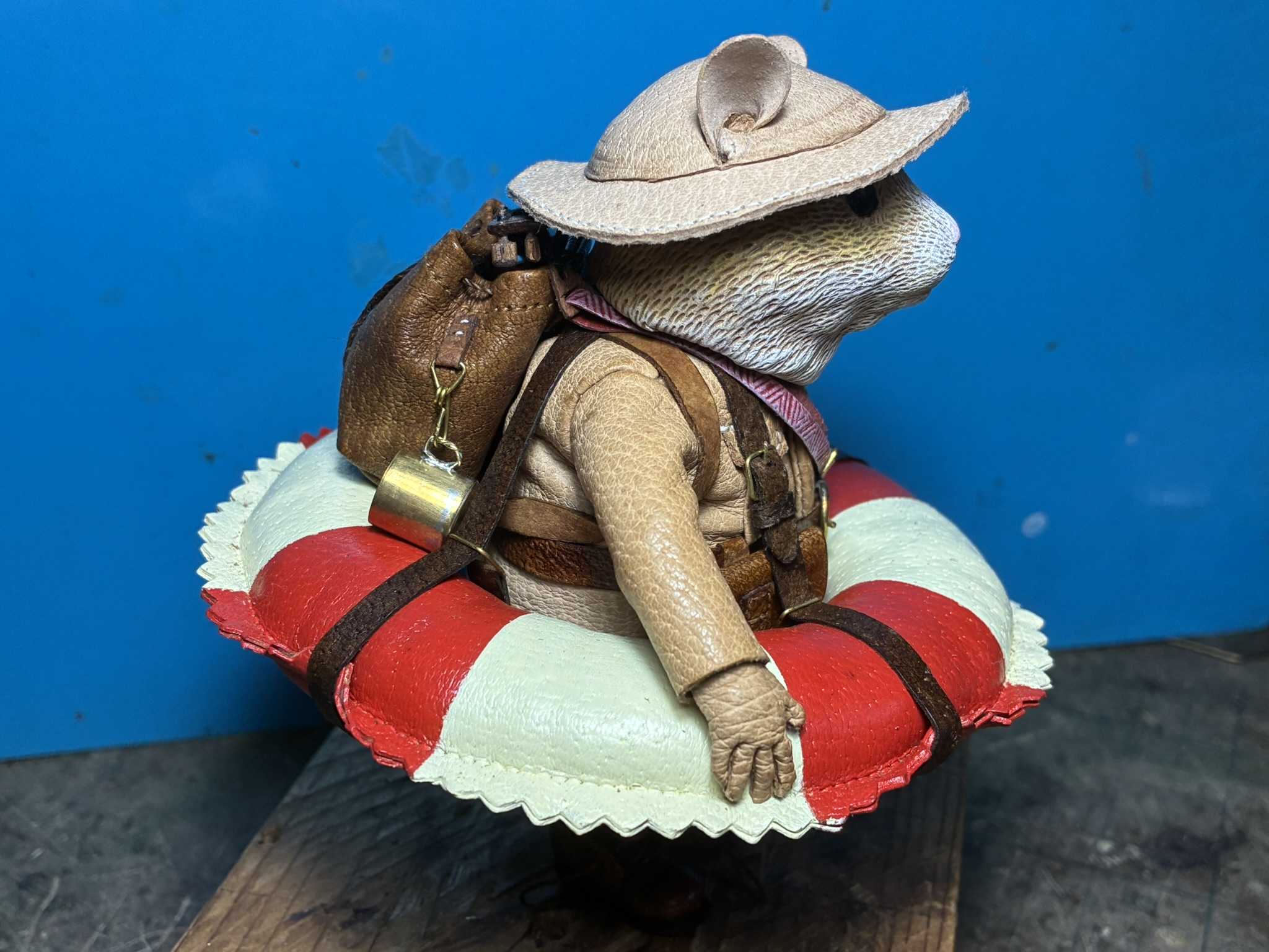 夢と遊び心をテーマに作品をつくっています。革人形の持つ小物や工具は、銀粘土で作成。