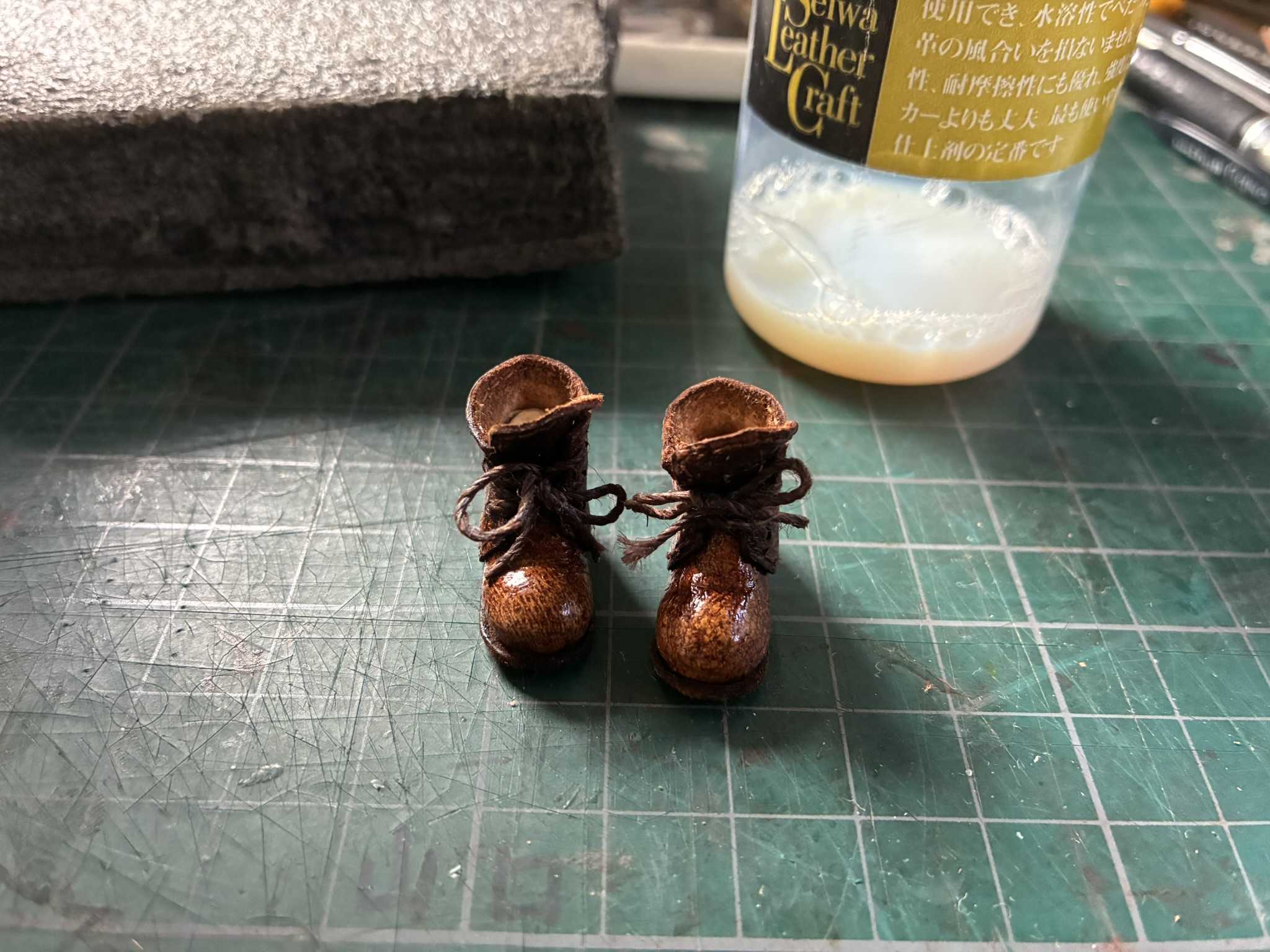 夢と遊び心をテーマに作品をつくっています。革人形の持つ小物や工具は、銀粘土で作成。
