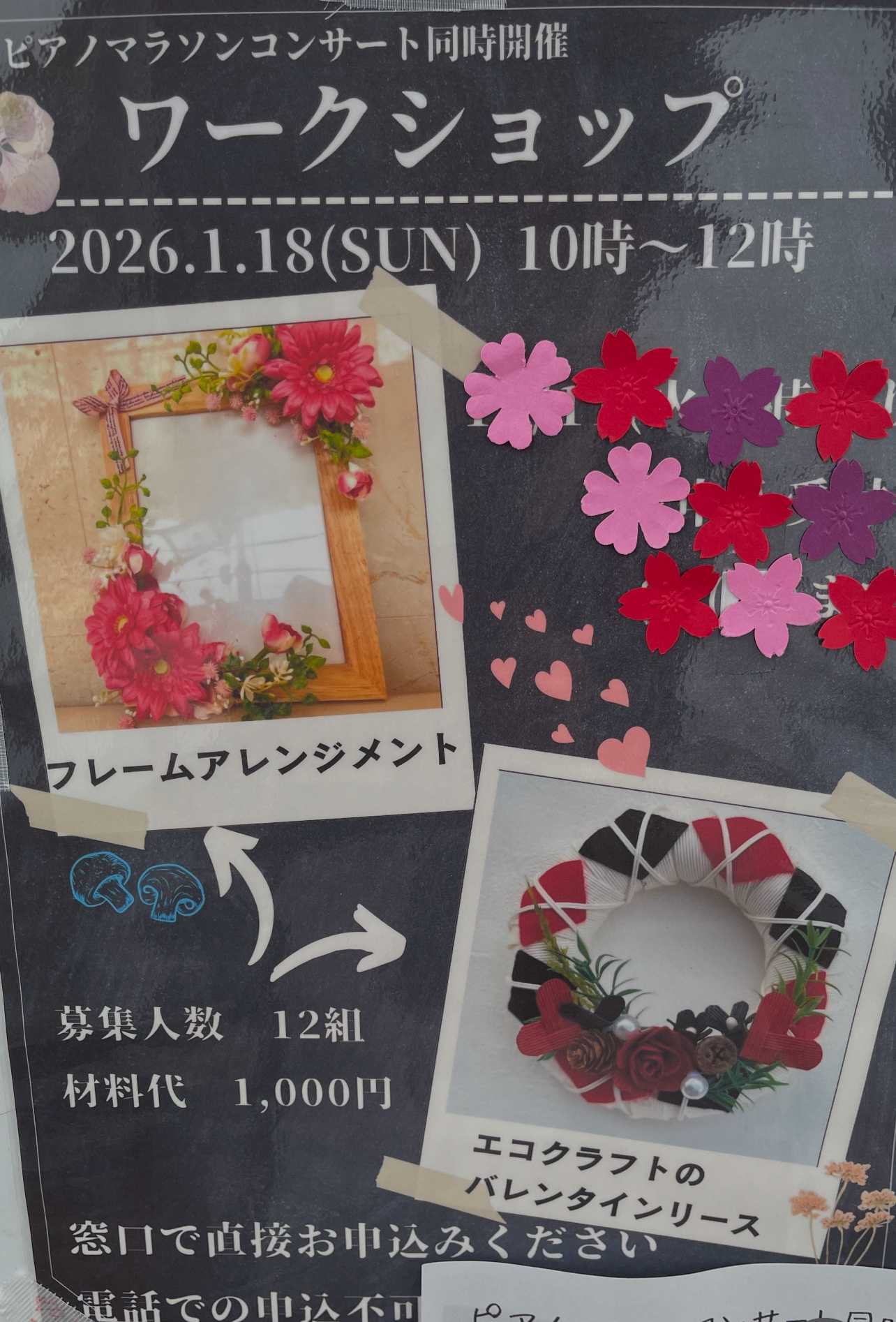 今日はワークショップの日 ![]() 今回はバレンタインリースを担当させて頂きました 昨夜から何度も忘れ物ないかチェックし 車に材料を積み込みました イベント(特にワークショップ)は準備が9割 準備中々大変でした~ 会場はいつもと違う雰囲気に包まれ すでに作品の販売コーナーは賑わっておりました ![]() 皆様~お目当ての作品はGETできましたか? * ハートの写真撮影コーナー ![]() いつもお茶会をしている休憩室も 今日はカフェに ![]() オープン前に撮影 ![]() 色々な場所に すてきなロウソク照明が飾られていて まるで韓国ドラマのワンシーンのようでした ![]() すてき~♪ * 10時~のワークショップも 大勢の方がご参加下さいました ![]() バラや木の実 グリーンやハートをアレンジ ![]() 世界にひとつだけの作品が完成しました ![]() 遠方から来て下さった方も。 ご参加ありがとうございました! イベント終了後は カフェでお茶time ![]() 仲良し職員さん手作りのサンドイッチも と~ても美味しかったです♪ すてきなお心遣いに感謝です * 時間の都合等で ピアノ演奏会は拝見できませんでしたが・・ きっとすてきなコンサートだったと思います ![]() お疲れ様でした 職員の皆様~準備から後片づけまで 大変お世話になりありがとうございました 明日は休館日ですね ゆっくり休んで下さいね お気に入りの記事を「いいね!」で応援しよう
