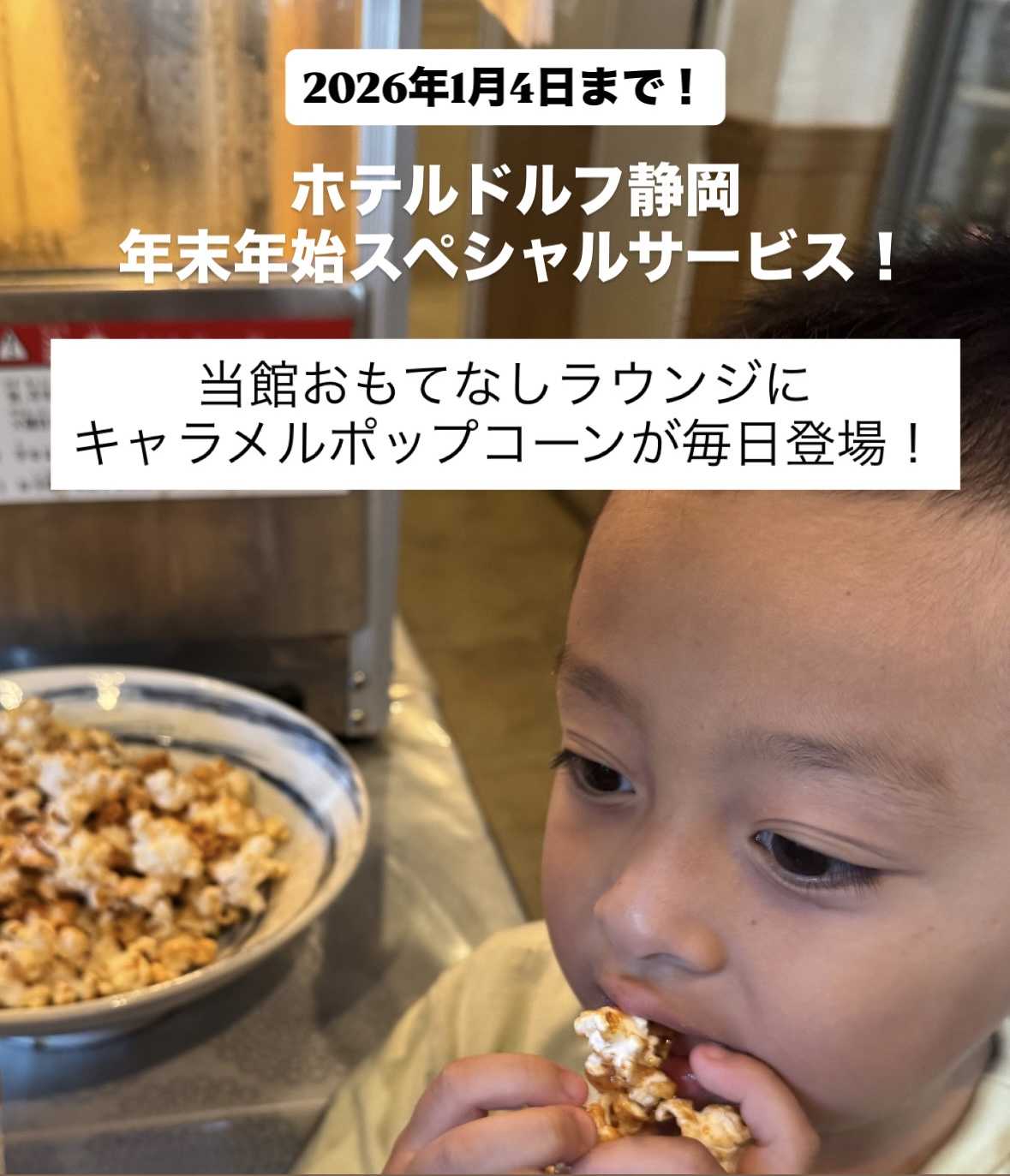 年始の直前予約、お日にちによってはまだ可能です! 1/4までは、おもてなしラウンジにて、ご家族に大人気のキャラメルポップコーンを特別サービス中!