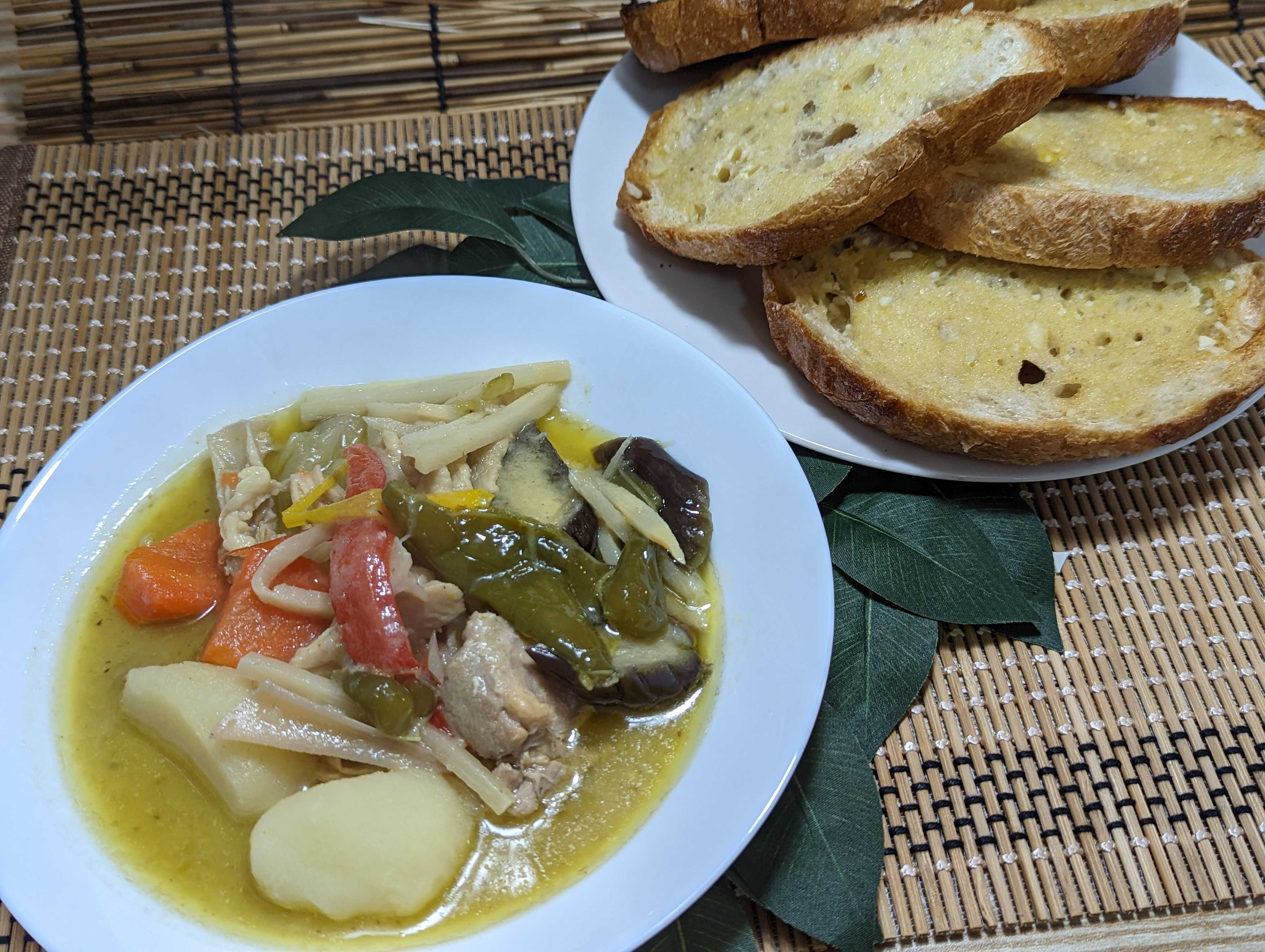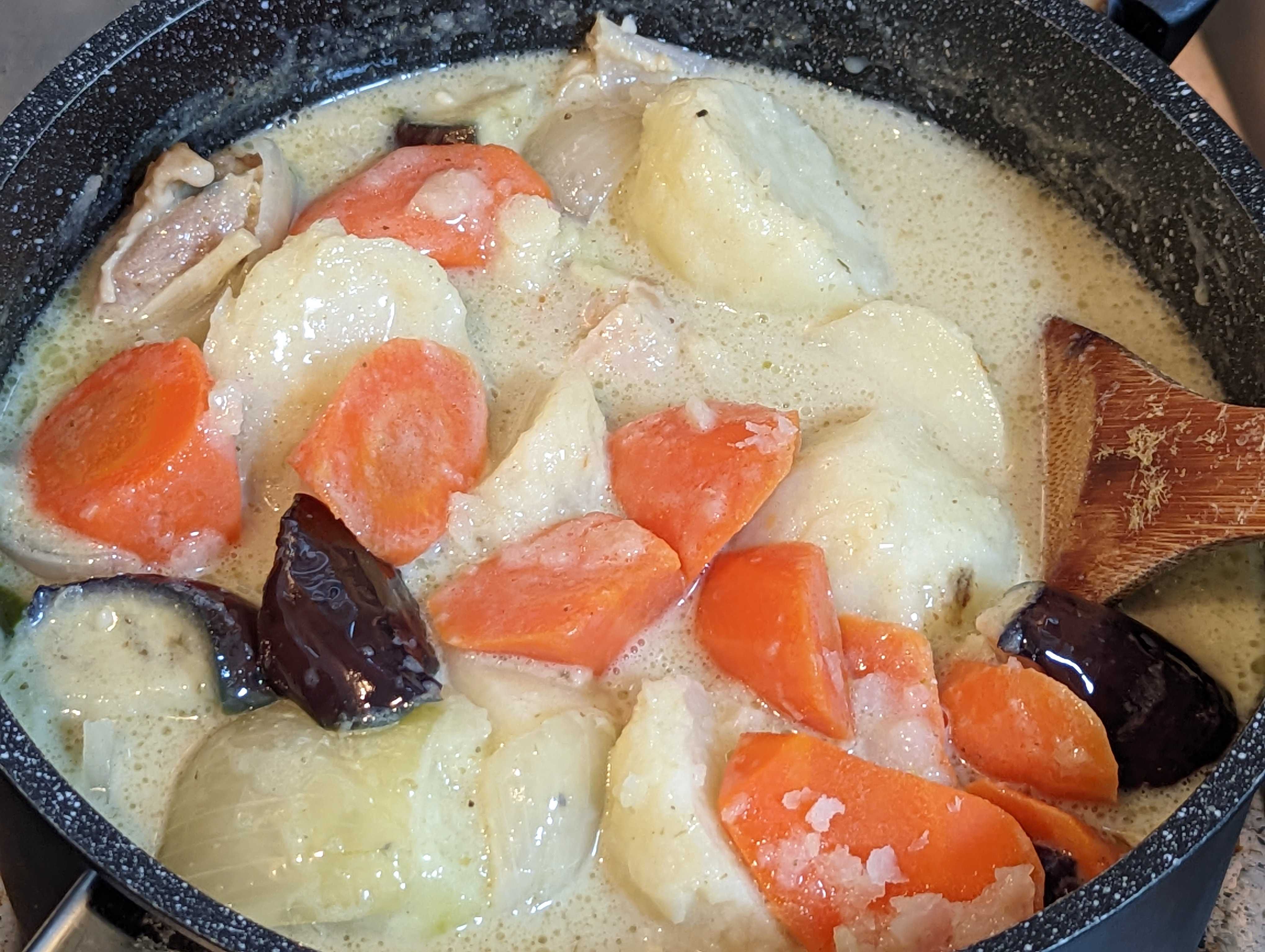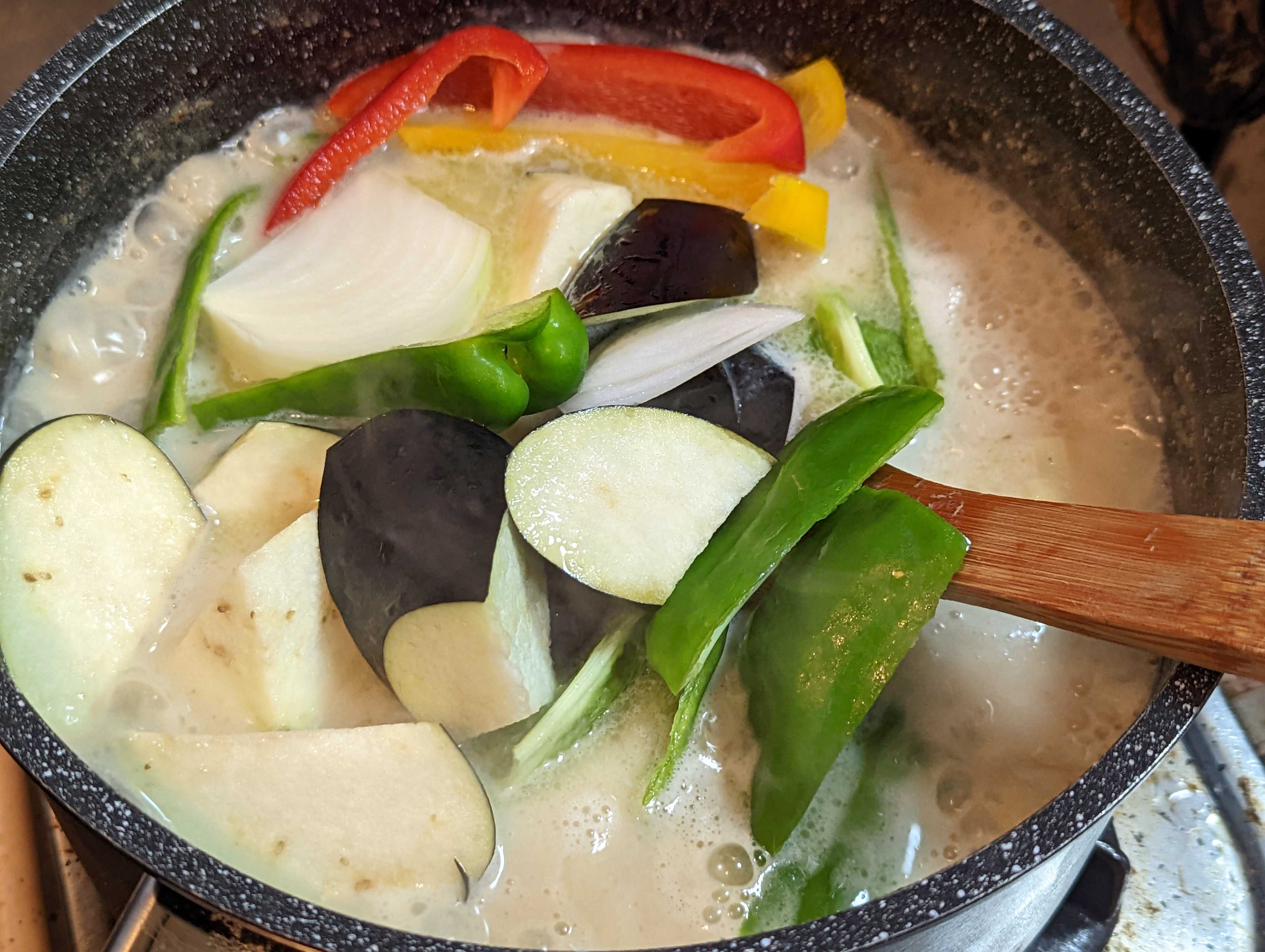 久しぶりに辛い食事をと思って グリーンカレー🍛作った🤩 ![]() ガーリックカンパーニュと一緒に🥰 ![]() 市販のグリーンカレーペーストとココナッツミルクで作っていきます。 ![]() たっぷりの具材で😊 筍、なす、ピーマン、パプリカ、玉葱、じゃがいもと人参は下茹で済😁 ![]() 今回はココナッツミルクのみで煮ていきます。 グリーンカレーペーストを溶かして、🐔もも肉、🐔ヤゲン軟骨、🐔皮があったので、全部投入😤 ![]() ローリエ🌿を入れて、じっくりコトコト☺️ ![]() 下茹野菜🥕🥔以外を投入😁 この辺で味を決めていきます😤 グリーンカレーペーストしか入っていないので、ただ辛いスープなので😅 鶏ガラとはまぐりだしで濃くを ナンプラーで香り付け、ライムジュース、塩コショウ、唐辛子、で味を決めて🫡 ![]() 🥕🥔投入で温まったら完成です☺️ ![]() 仕上げに蜂蜜🍯でまろやかな辛さにしてます🥰 ※辛いの苦手な方なので🤣 ![]() ガーリックカンパーニュは、マーガリンに刻みニンニクを混ぜて焼いただけ トーストして、ガーリックマーガリンを塗って、更に焼くと美味しいですよ♥ ![]() おまけのサラダ🥗もちょいタイ🇹🇭風 ライムジュース、ナンプラー、唐辛子、塩コショウ、EXオリーブオイルでドレッシングを作ってます😋 お気に入りの記事を「いいね!」で応援しよう
