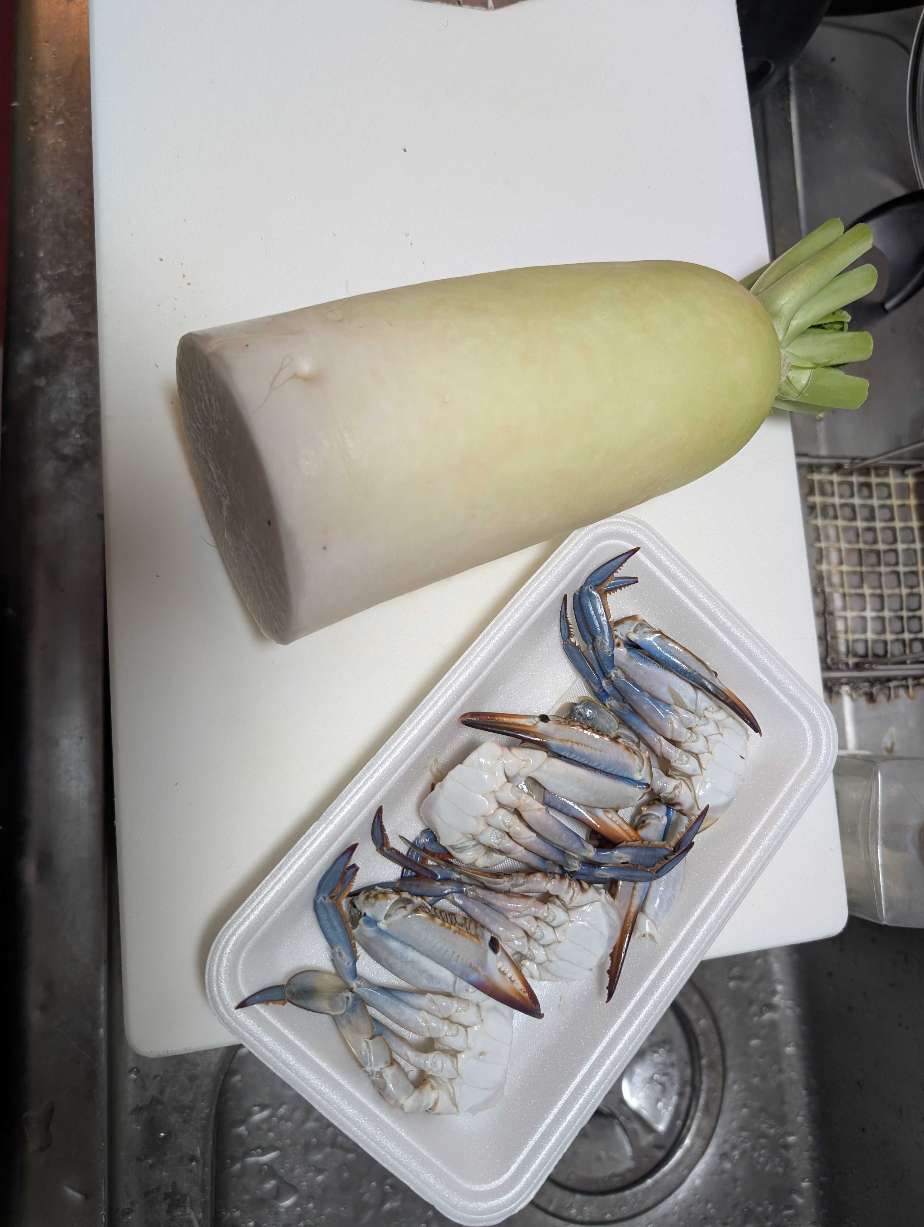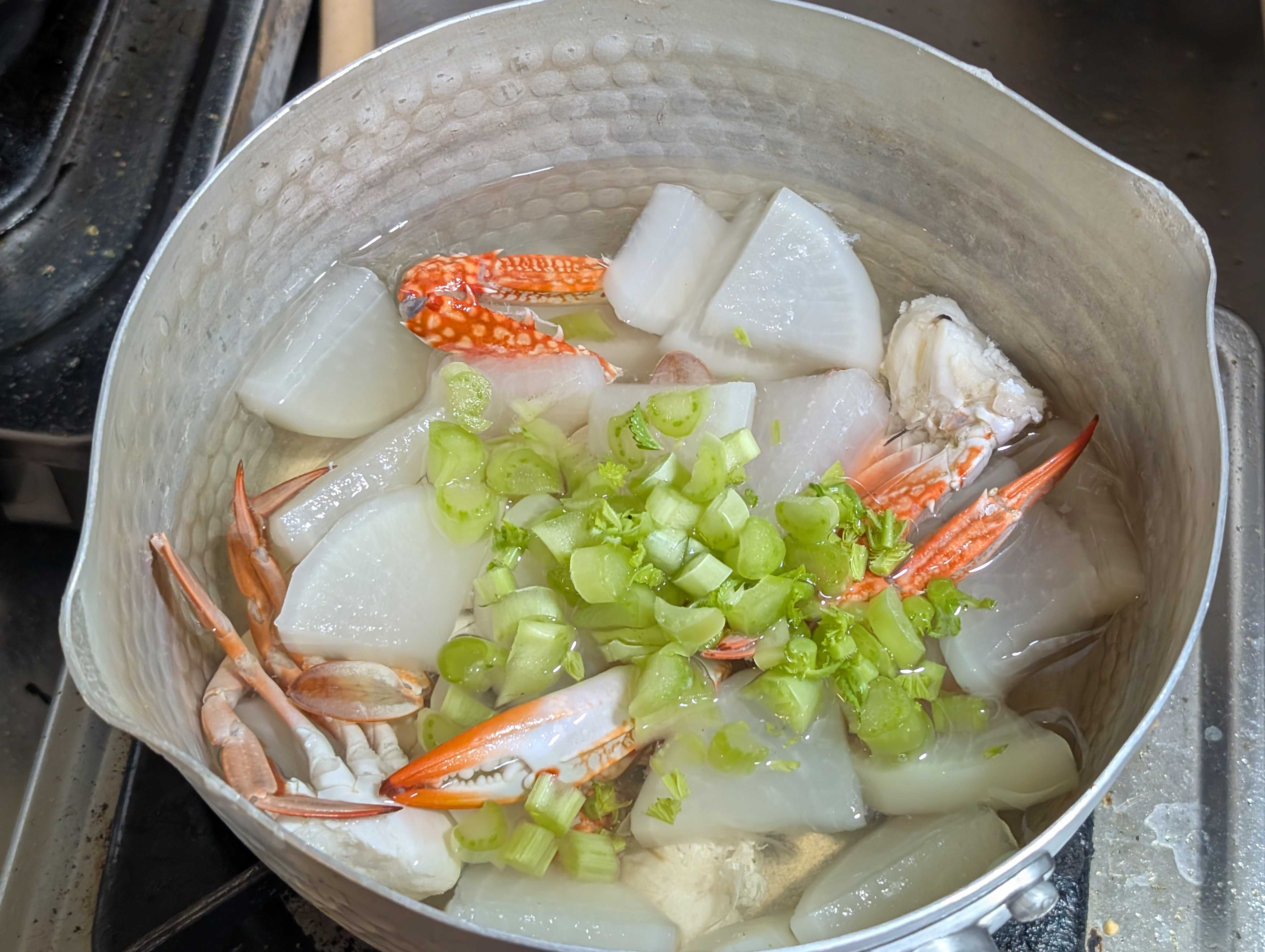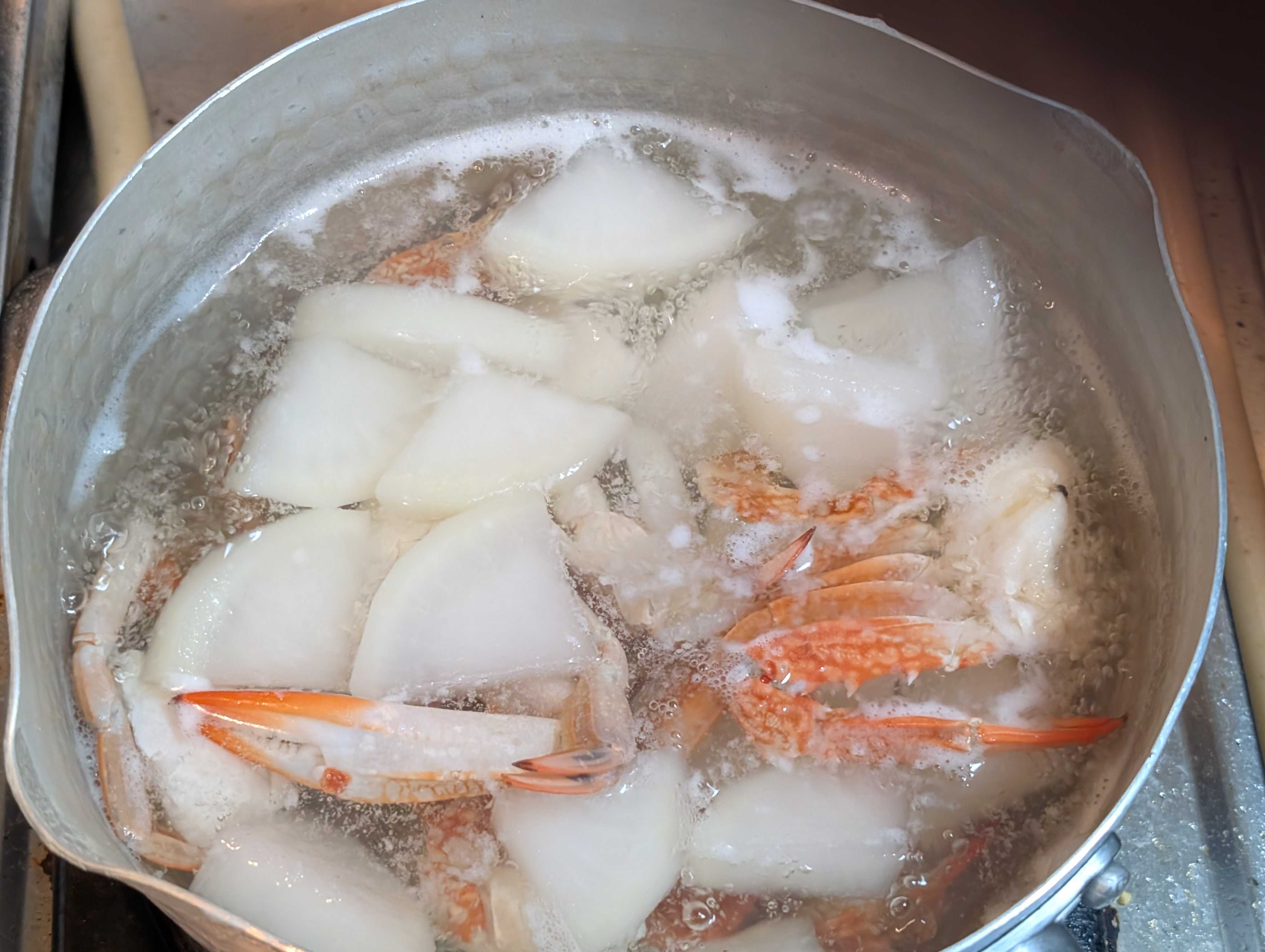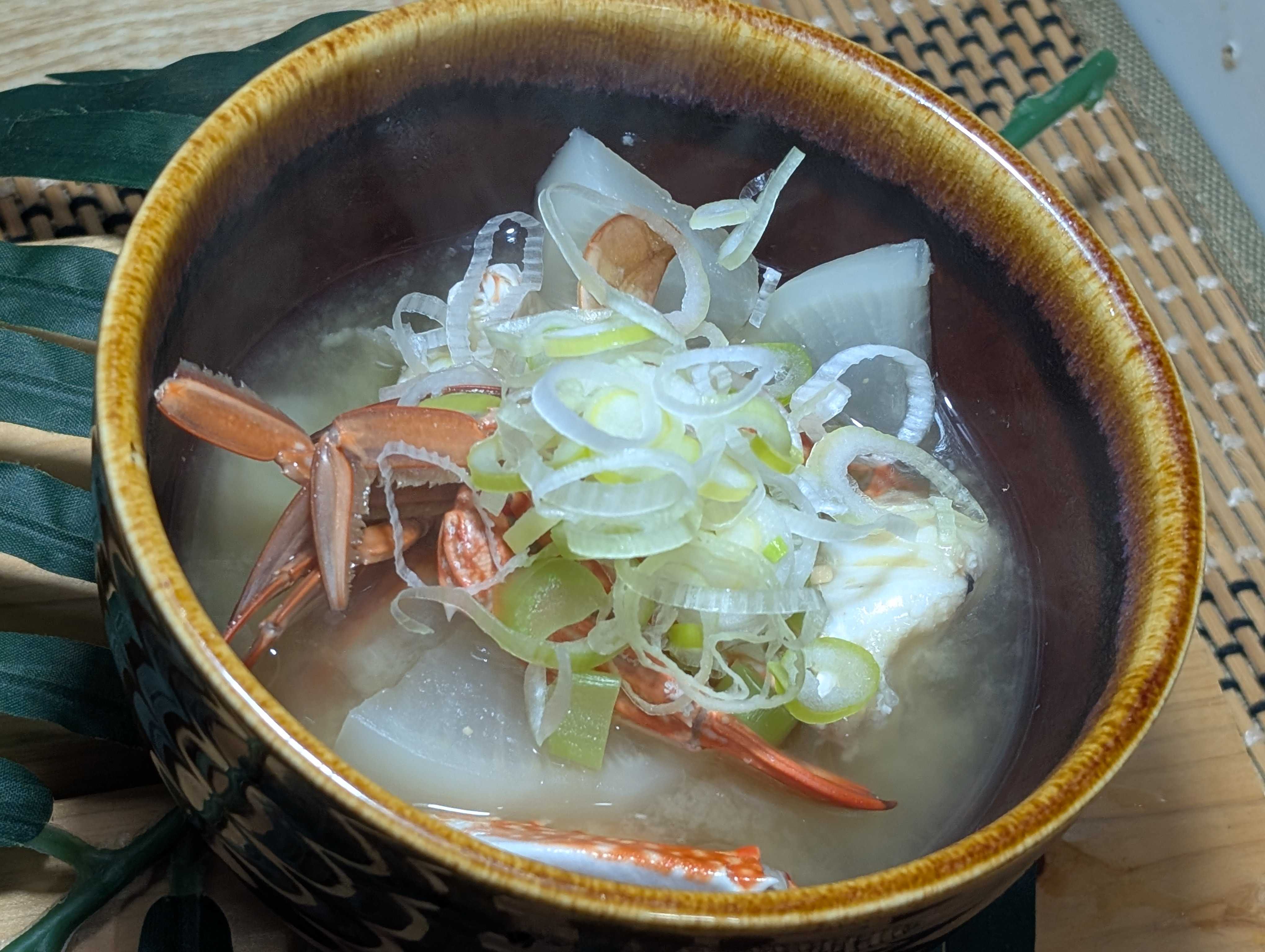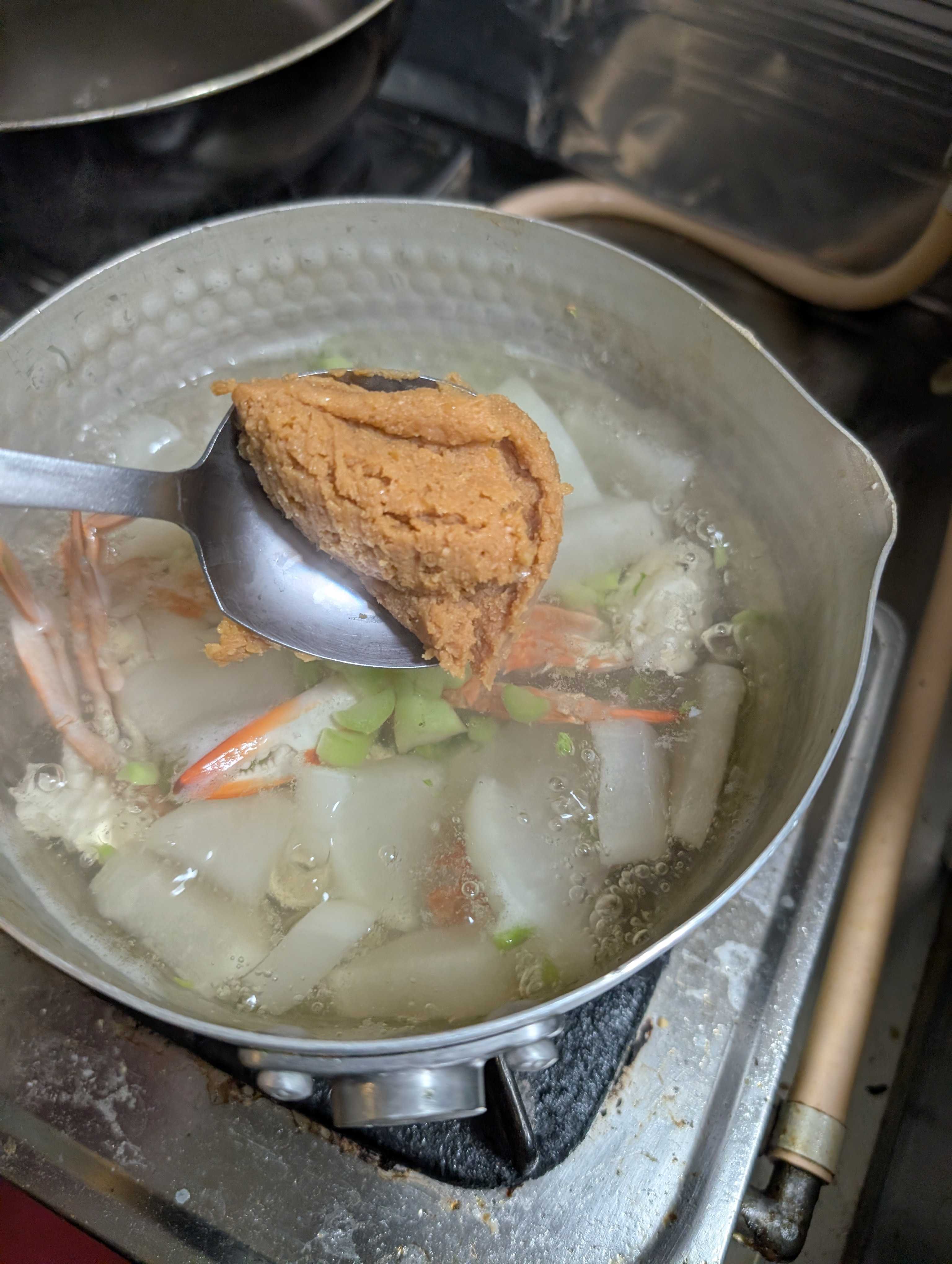 お味噌汁を欲する季節❄️ ご近所スーパーで激安渡り蟹🦀 普段はスパゲッティ🍝🇮🇹にするのですが、、、 今回は大根と煮ていきます お水と少々お塩で水から煮ていきます アクが結構出ますのですくって 大根が透き通ってきたら 大根の葉☘️もいれて 🦀だしが凄く出ているので、お味噌は入れすぎないように😲 🦀香りが部屋中に👃 たっぷり葱乗せて頂きま〜す😋 ちなみに渡り蟹🦀は¥150位でした~🤗