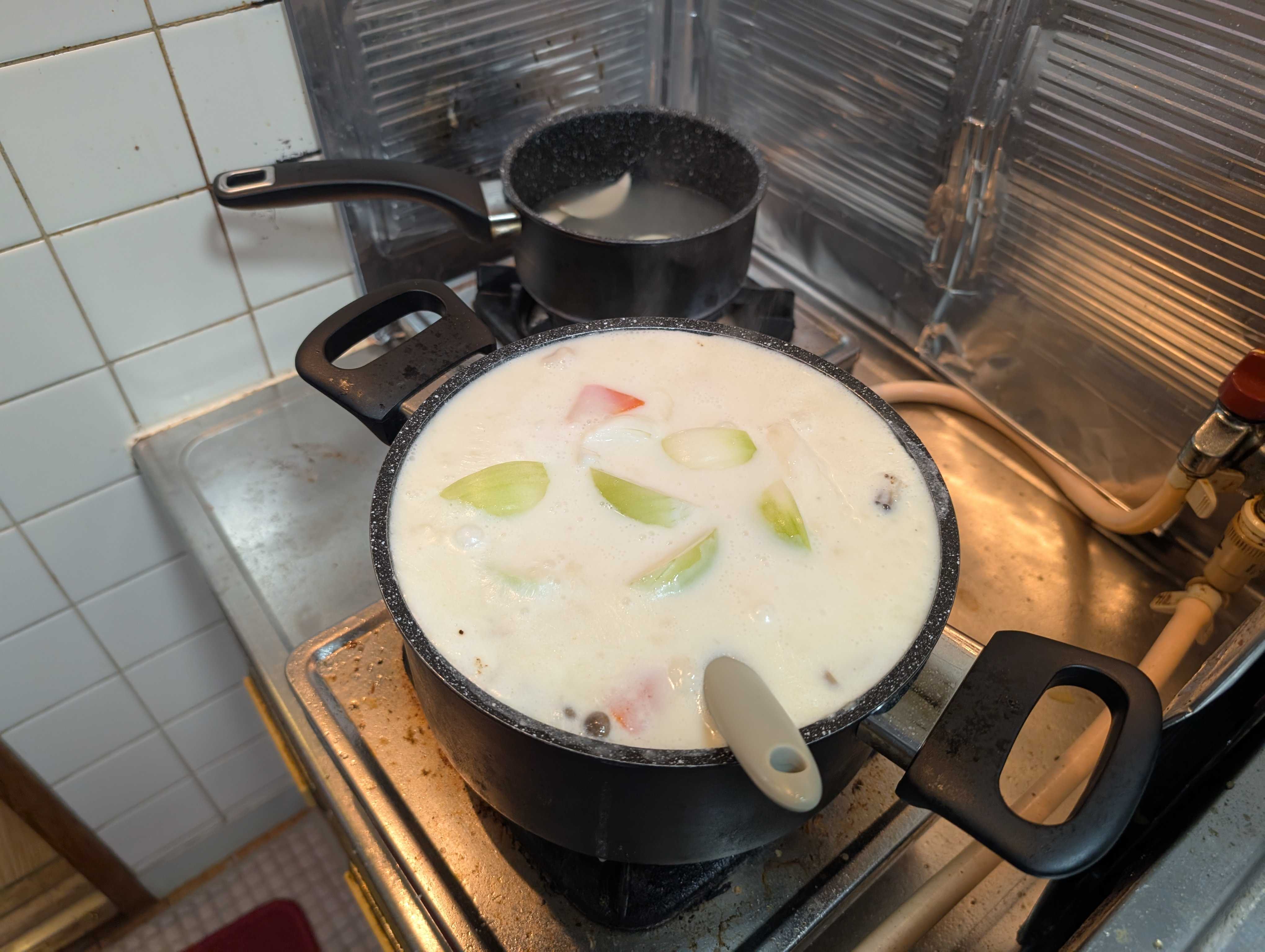 サクッとクリームシチュー🍲 🐔鶏手羽中スペアリブ 安いしガラスープも取れてお肉はシュリュットほぐれてしまうおすすめです😊 ひたひたの水で人参🥕と🐔手羽中を強火🔥で 一気にアクが出るのでここは奇麗にすくいましょう 🐔手羽中が良い感じでスープが出たら、お水を足してじゃがいも🥔入れます😲 最初から🥔入れると崩れちゃうので😱 しめじ🍄も足して、煮えたら牛乳🥛たっぷり入れたいのでスープを少しストックします(後日スープ) 牛乳🥛たっぷり投入 今回は市販ルー使用、ボウルで溶かしてペーストにして ペーストのシチュールーを加えて 塩胡椒、コンソメ等で自分好みのお味に 寒〜い❄️冬サクッとクリームシチュー🍲だね