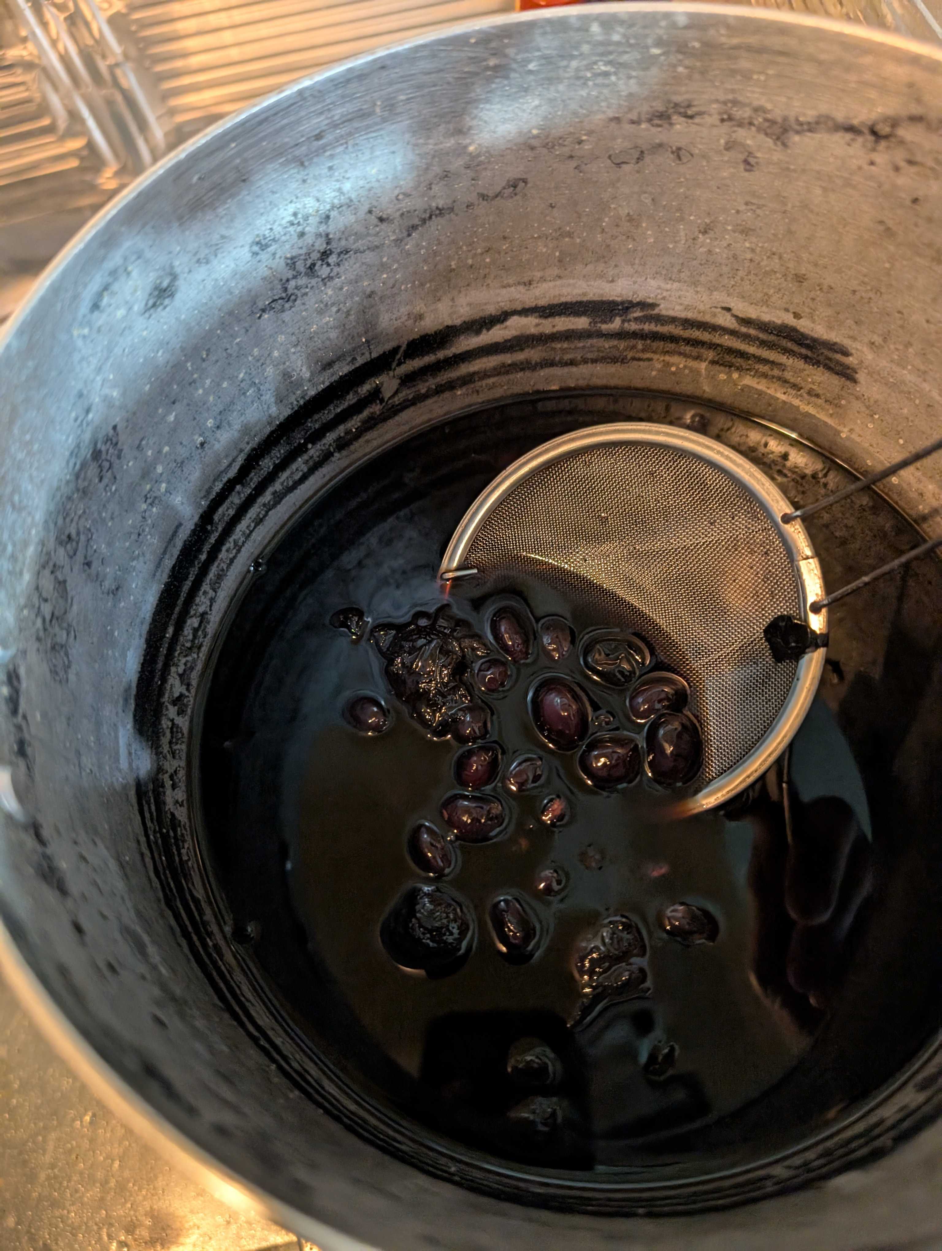 2025年 黒豆🫘完成です✨ 今年は知人のお店分も サッと洗って 色落ち防止の鉄タブレットと鉄 甘味はブレンド、三温糖、ザラメ糖、黒糖、きび砂糖、後は塩、醤油 アクを取ります アクを取り除いて プルーン投入、フルーティーな甘味、香りと色落ち防止 落とし蓋をして一晩🛌 一晩寝かしたら2時間程煮て、冷ますを2回繰り返して シワ無し、色落ち無し、テカリ良し 甘味は控えめ、ブレンド甘味で美味 今年も楽しかった😁黒豆🫘ちゃん 美味しゅうございます😊