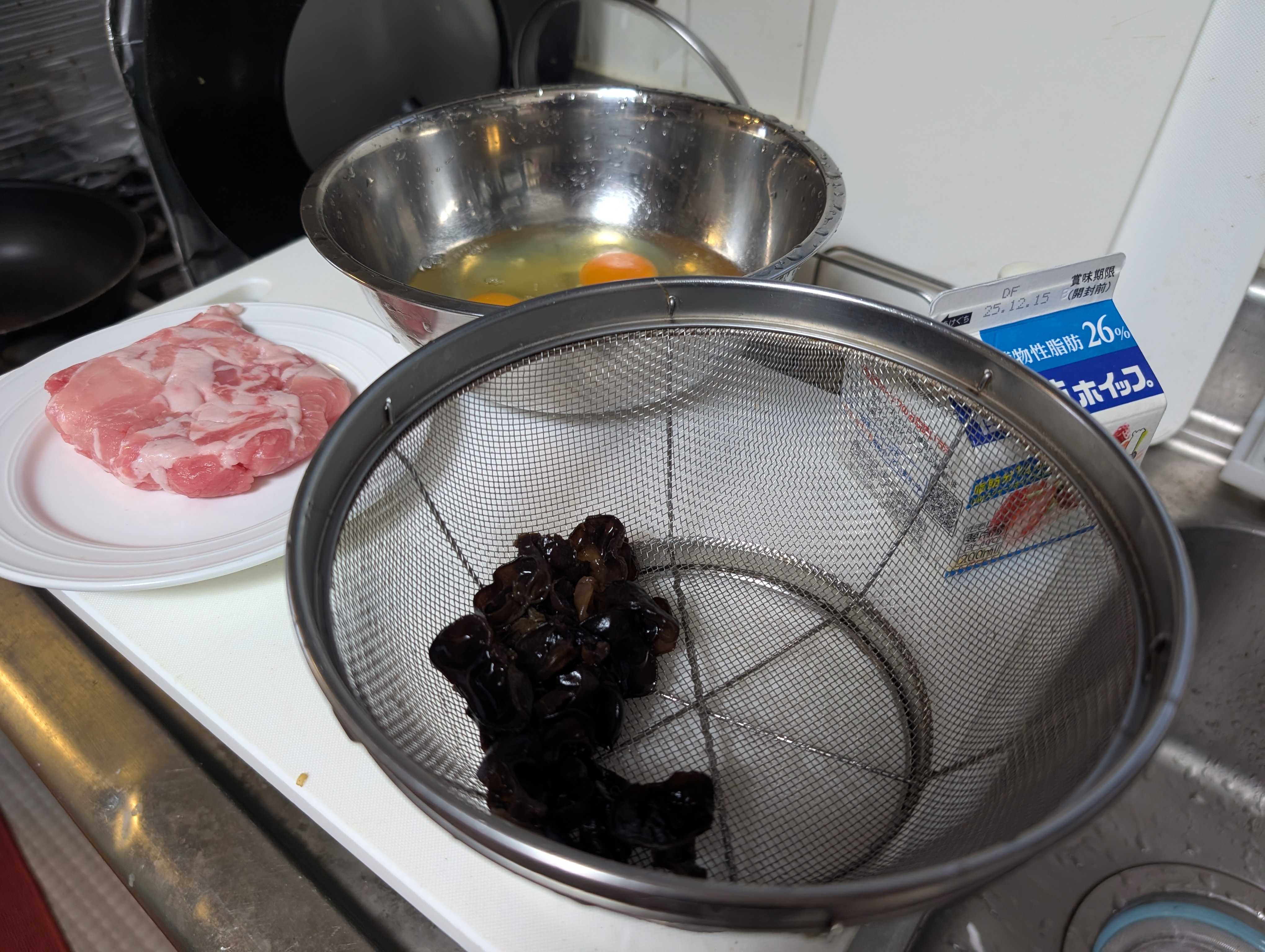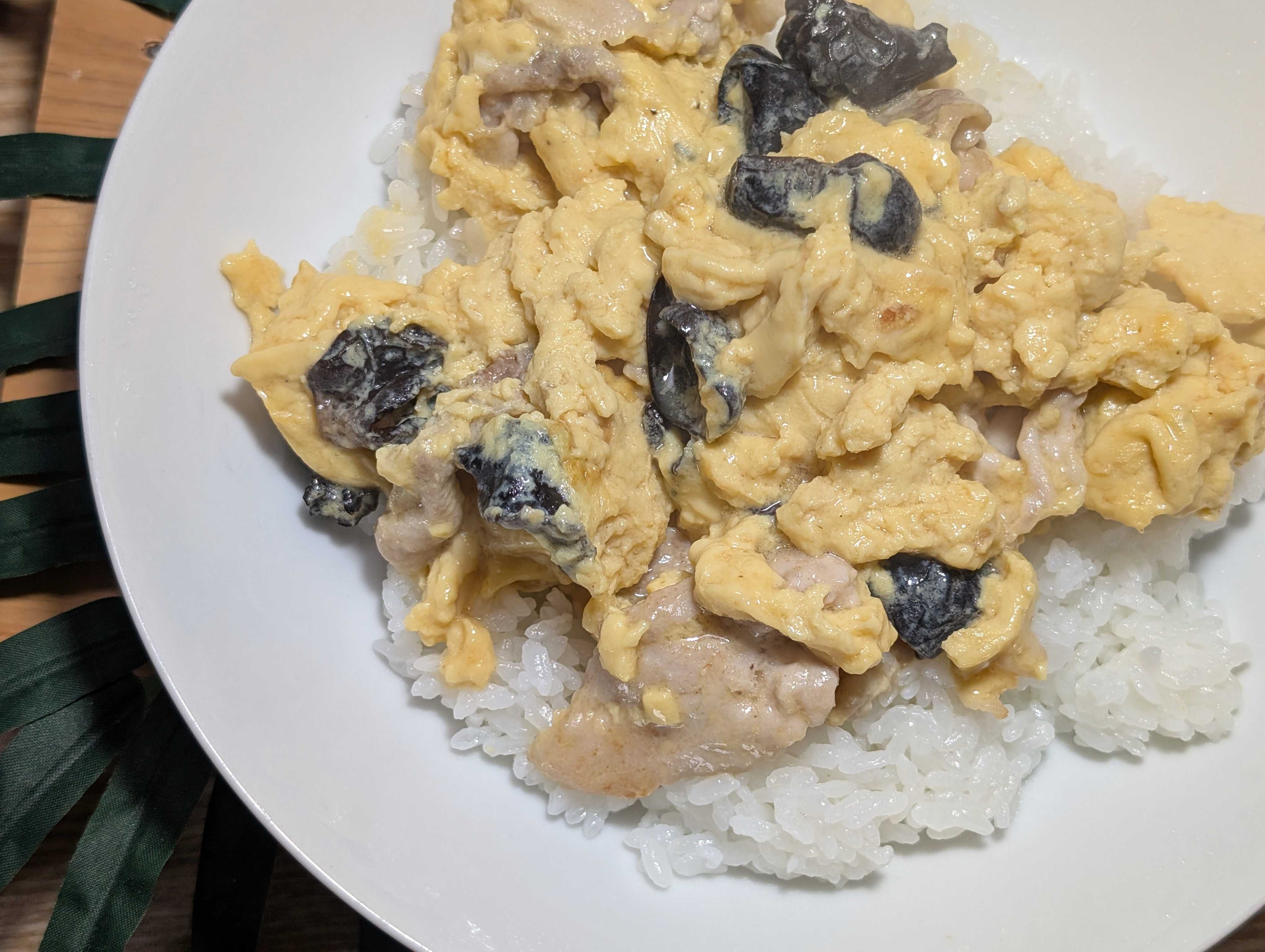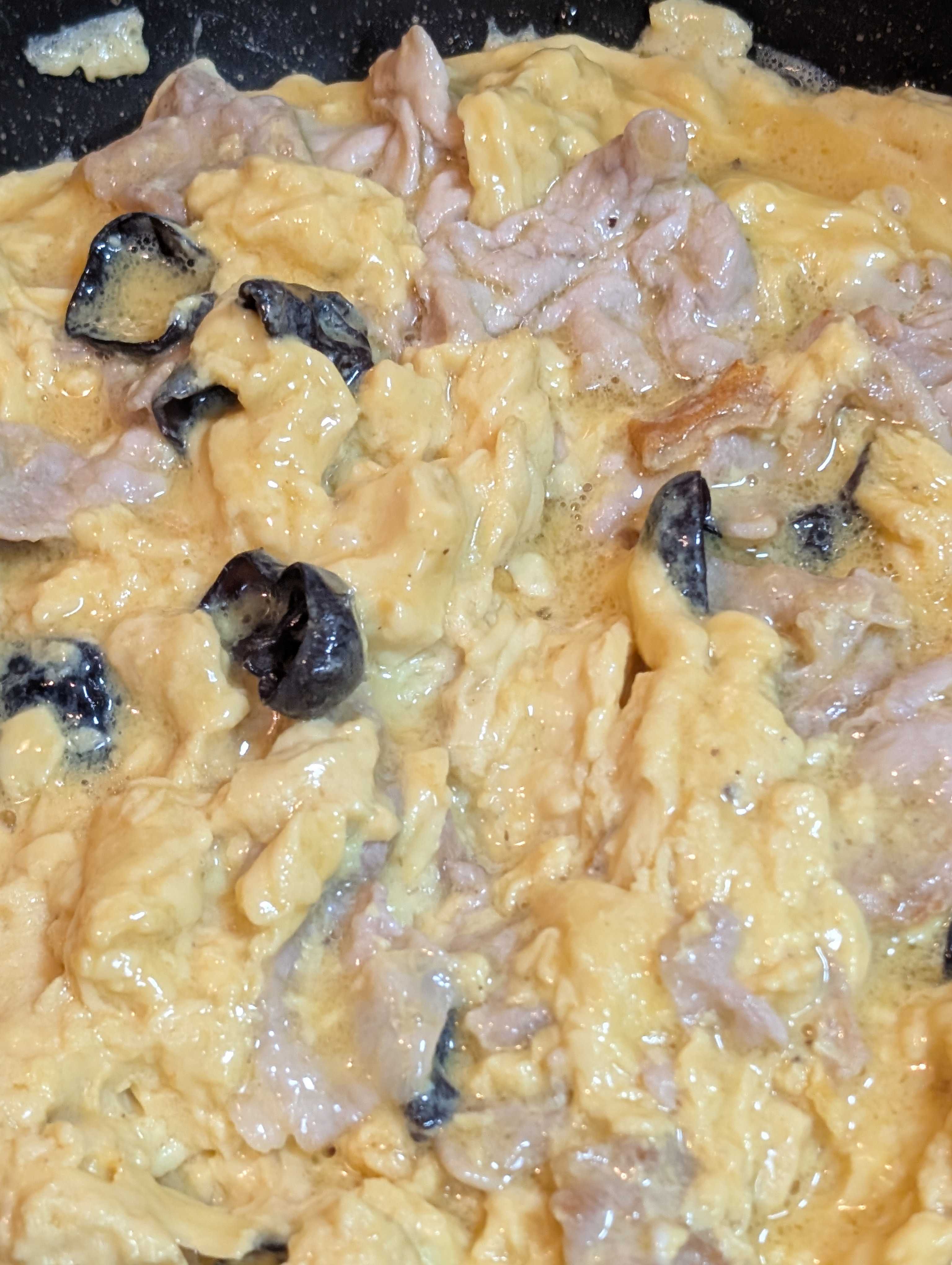 卵🥚と生クリームが冷蔵庫に、、、 木耳戻して、ストック豚🐷肉解凍 全卵と生クリームよ〜く混ぜて オイスター🦪ソース、塩胡椒で味付け 豚🐷肉、木耳をサクッと炒めて 卵液投入 ゴムベラでふわっと返して ふわっとトロッとお手軽「木須肉」 オッサン一人飯🍚なので丼で😋