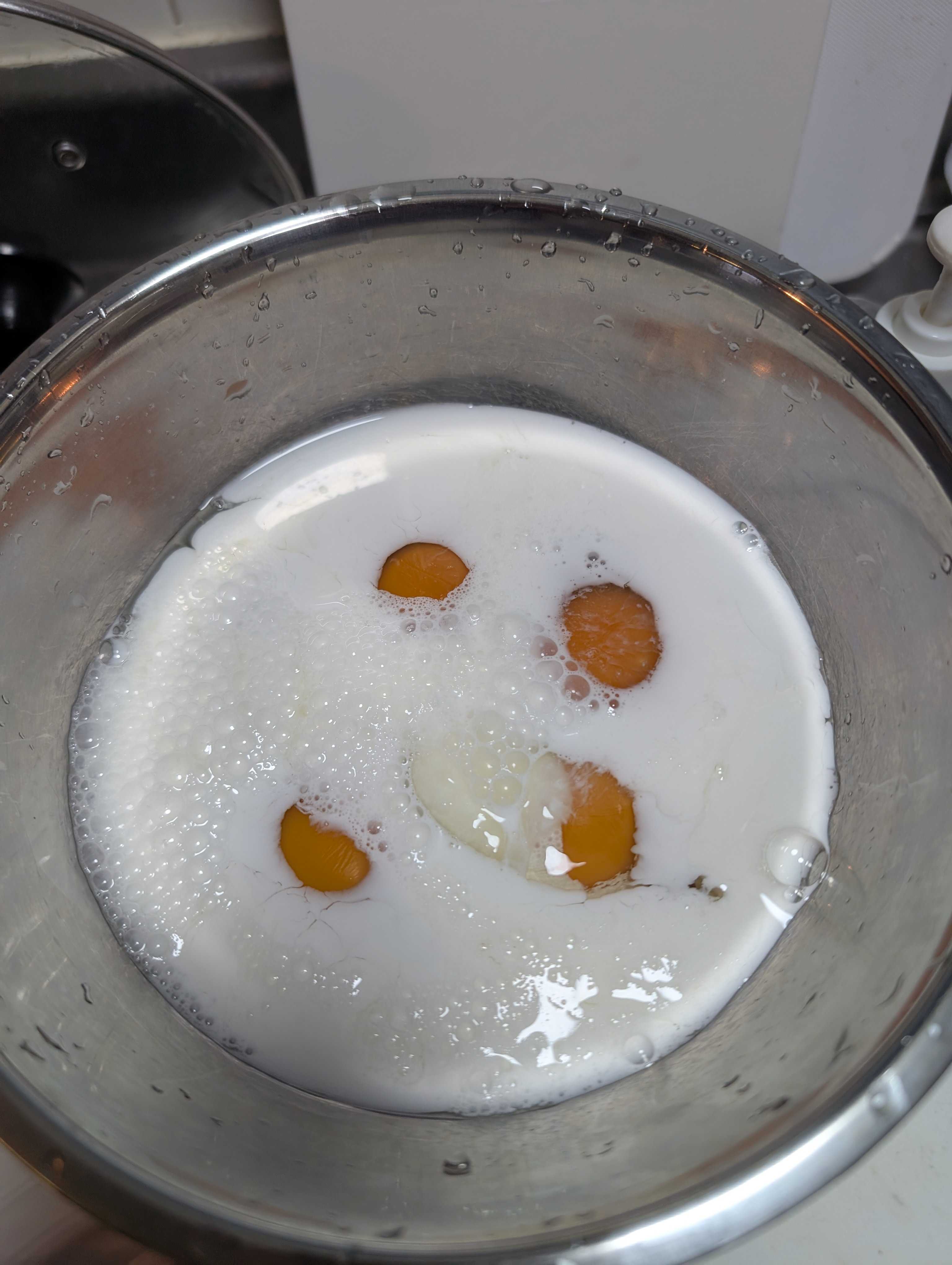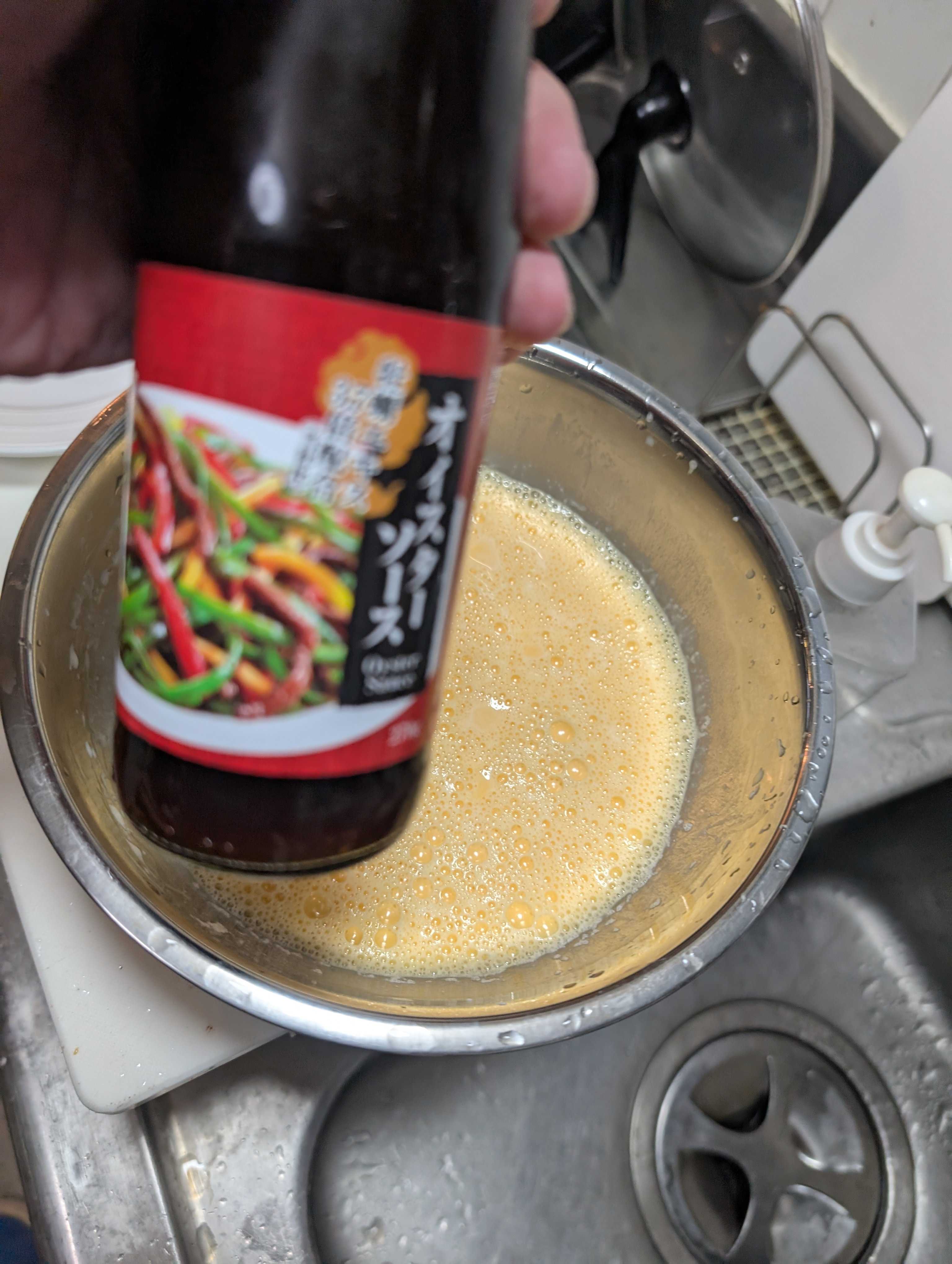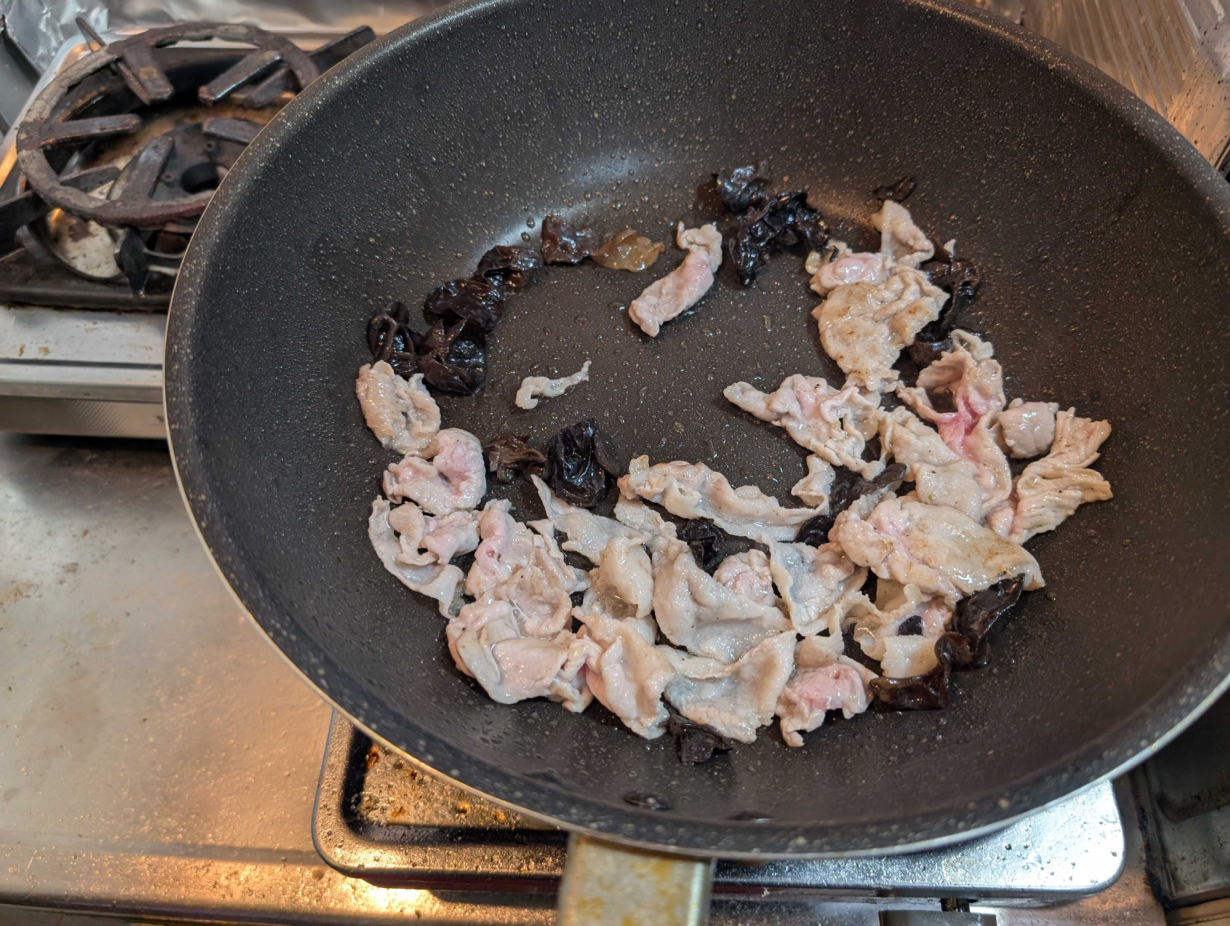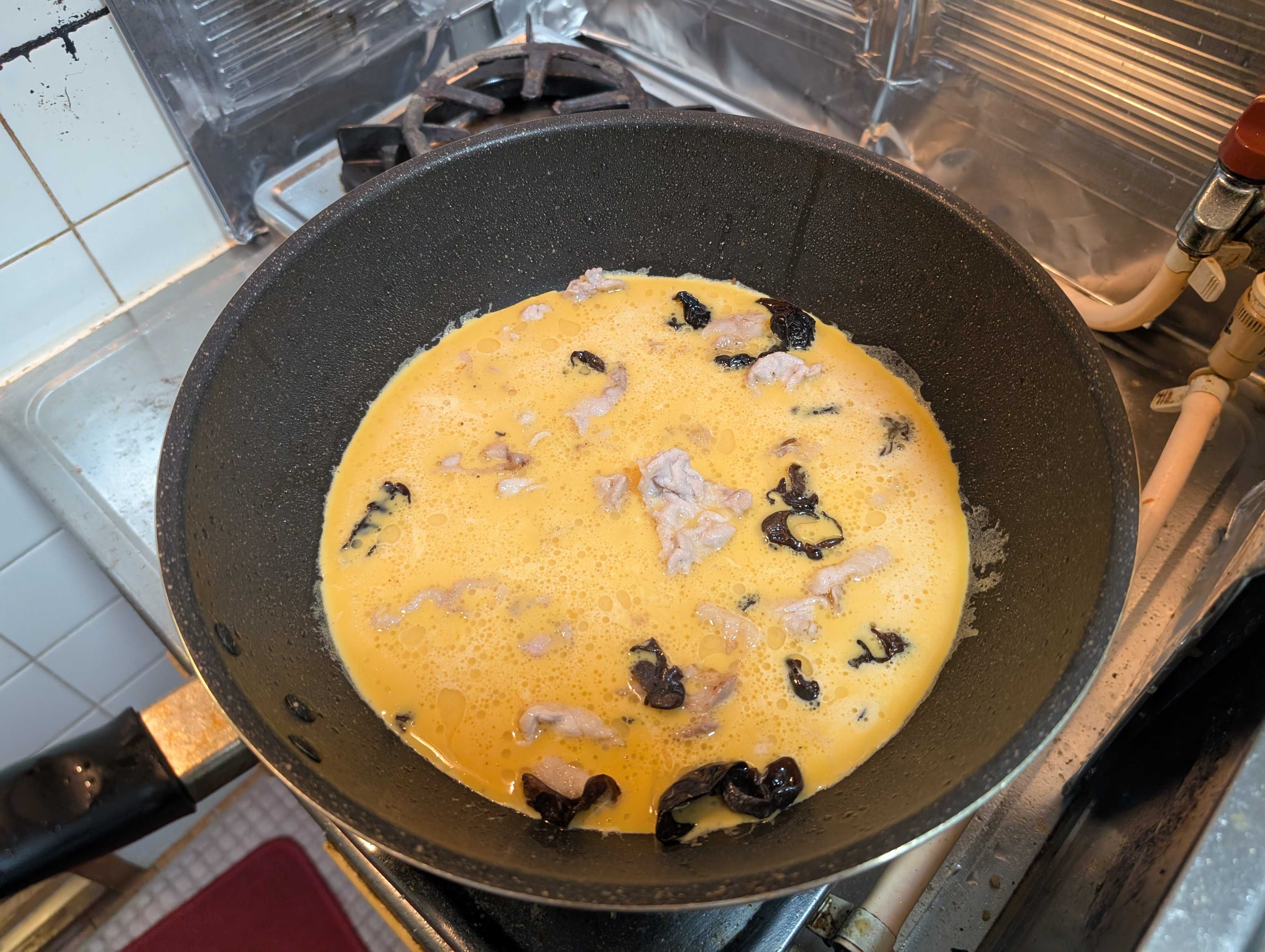 卵🥚と生クリームが冷蔵庫に、、、 木耳戻して、ストック豚🐷肉解凍 全卵と生クリームよ〜く混ぜて オイスター🦪ソース、塩胡椒で味付け 豚🐷肉、木耳をサクッと炒めて 卵液投入 ゴムベラでふわっと返して ふわっとトロッとお手軽「木須肉」 オッサン一人飯🍚なので丼で😋