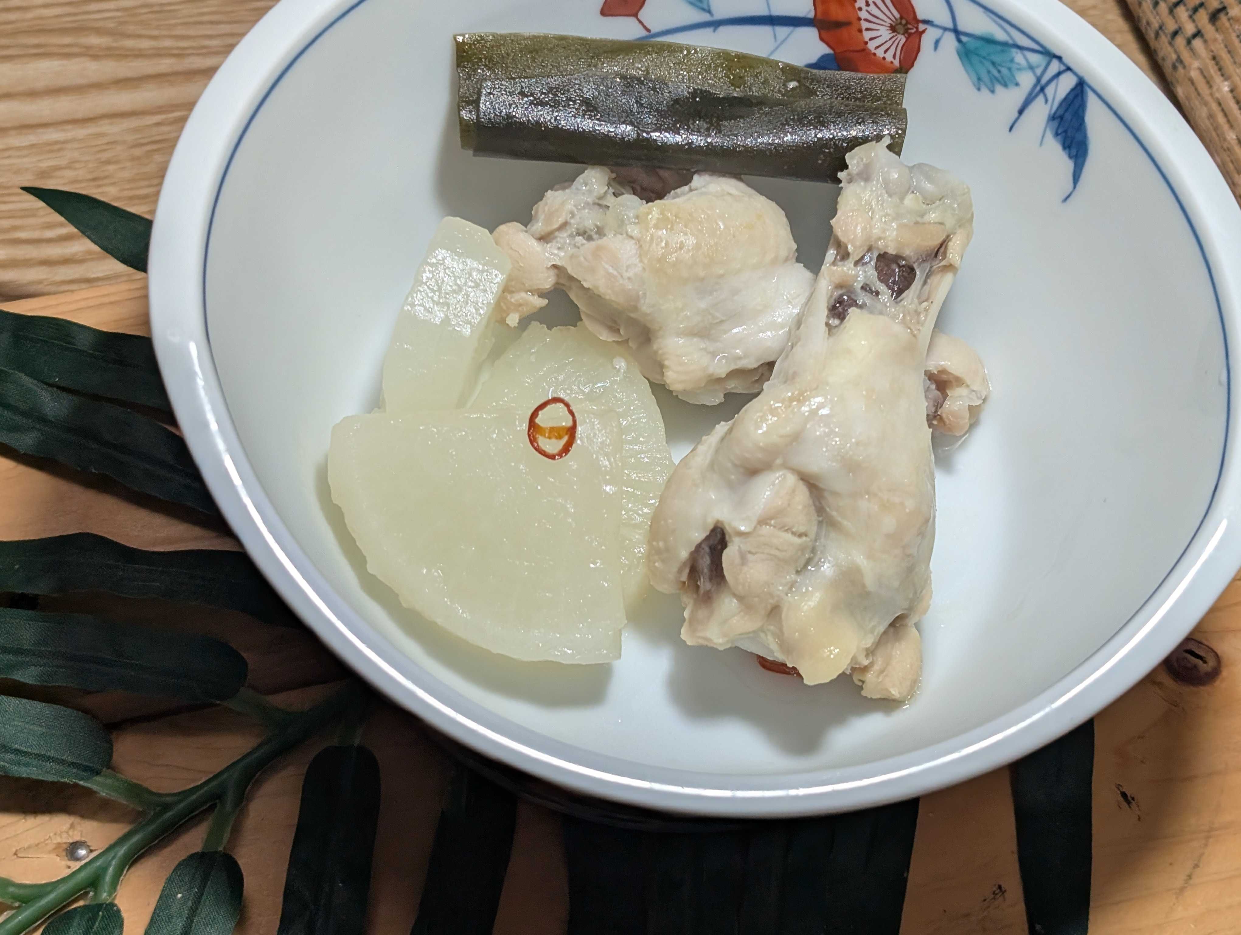 塩味のみです✨ 🐔手羽元を水から煮ていきます アクがドバっと出てくるのですくいましょう アクをきれいに取ったら少量の塩投入 大根投入 🐔手羽元と塩で美味しいのですが、、、 昆布🌊投入してみた。 コトコト煮てこのスープでラーメン🍜最高 ちょっとおしゃれに盛り付け スープはコラーゲンのかたまりです✨
