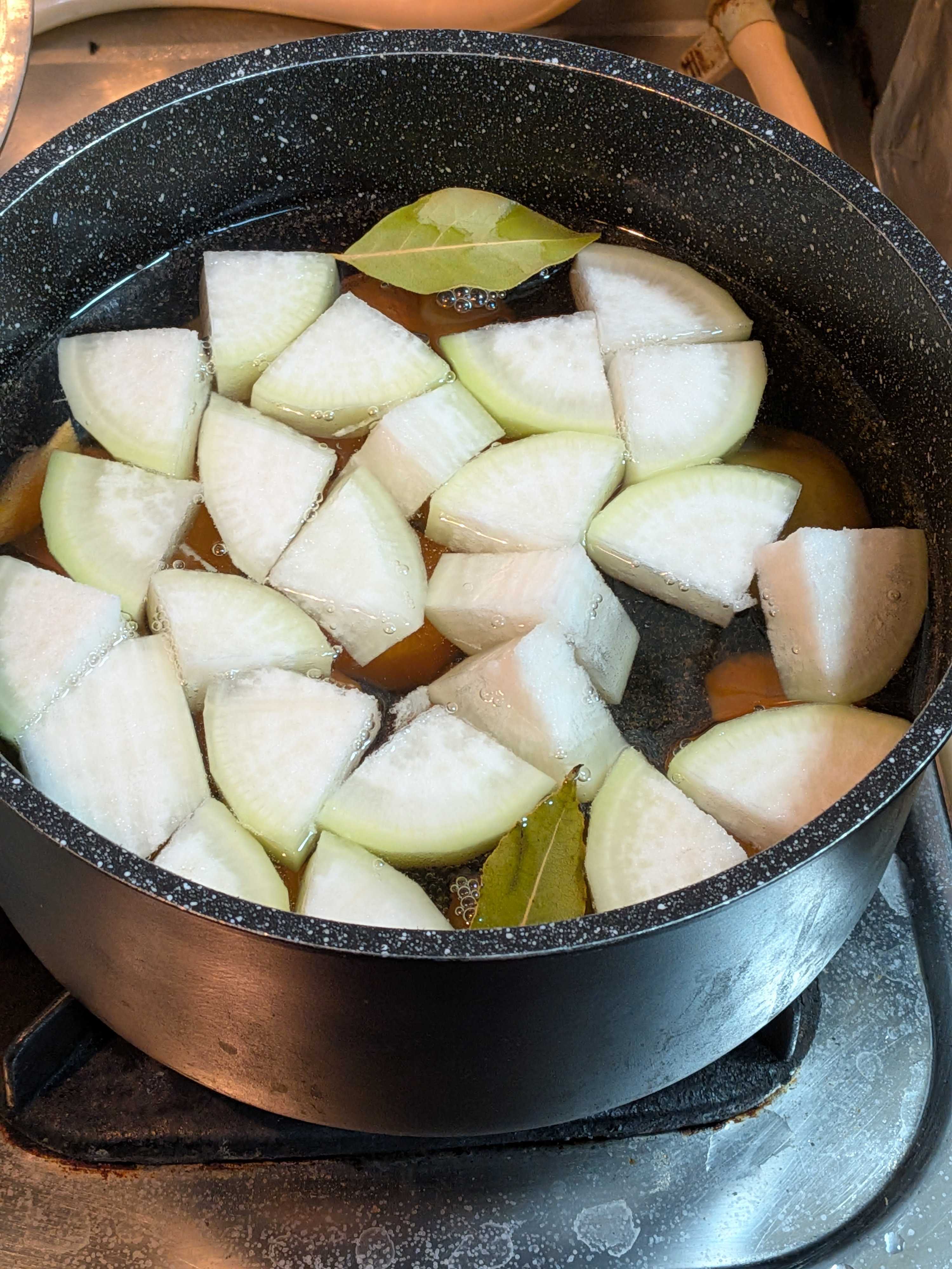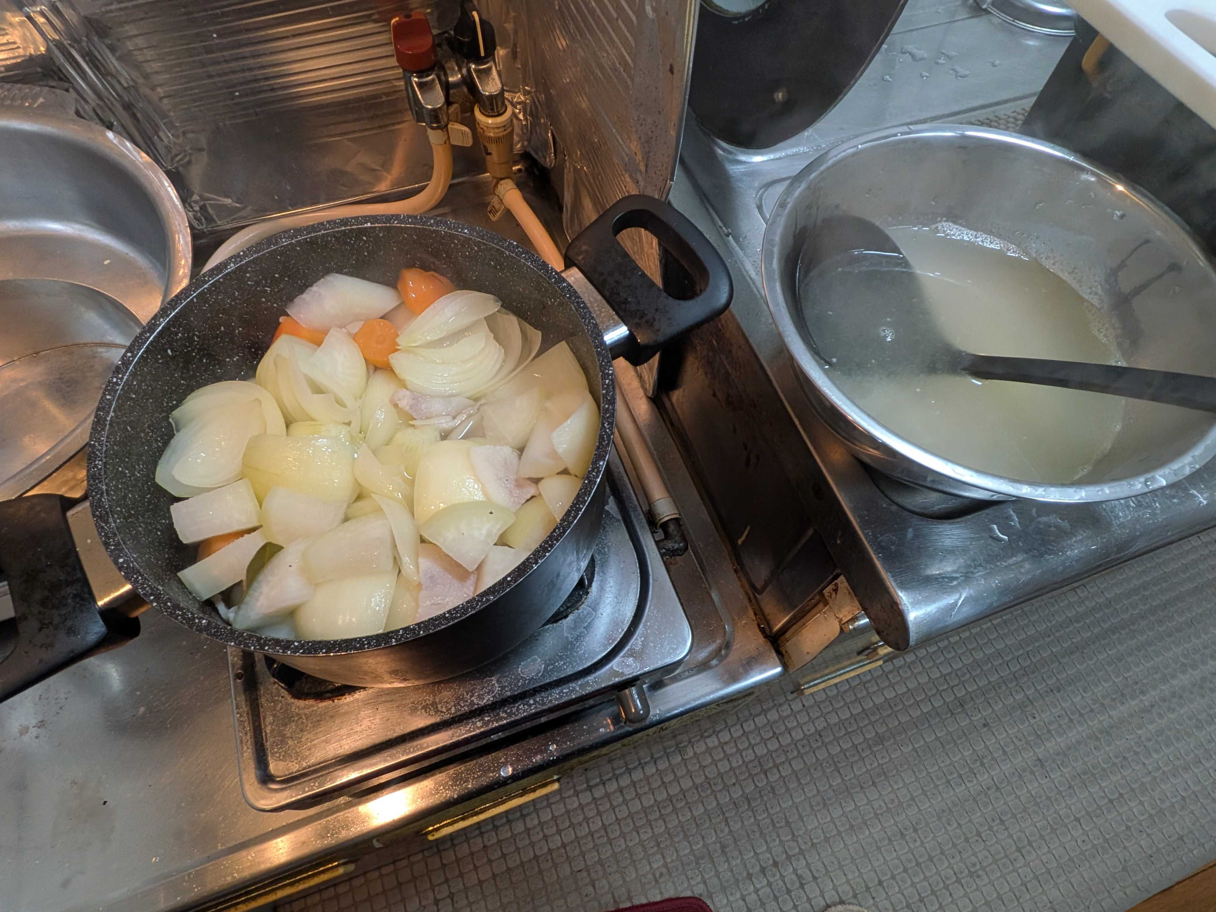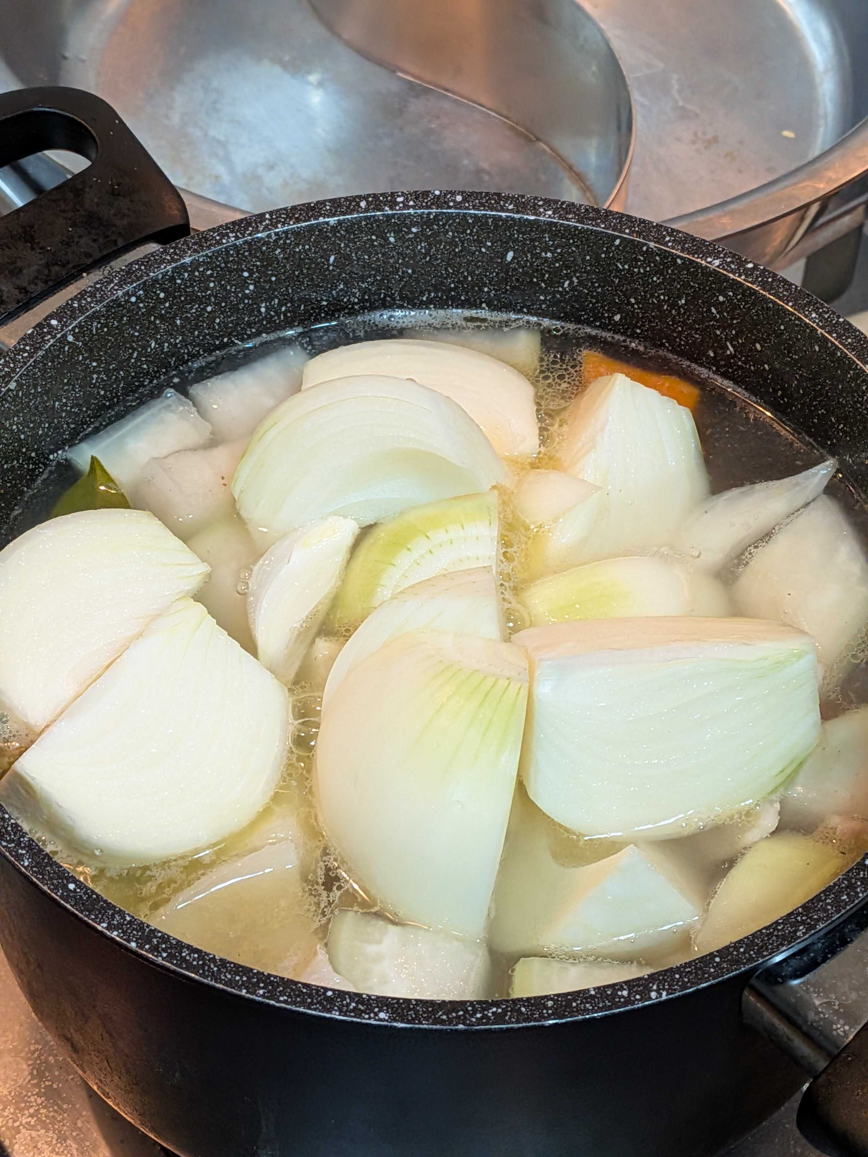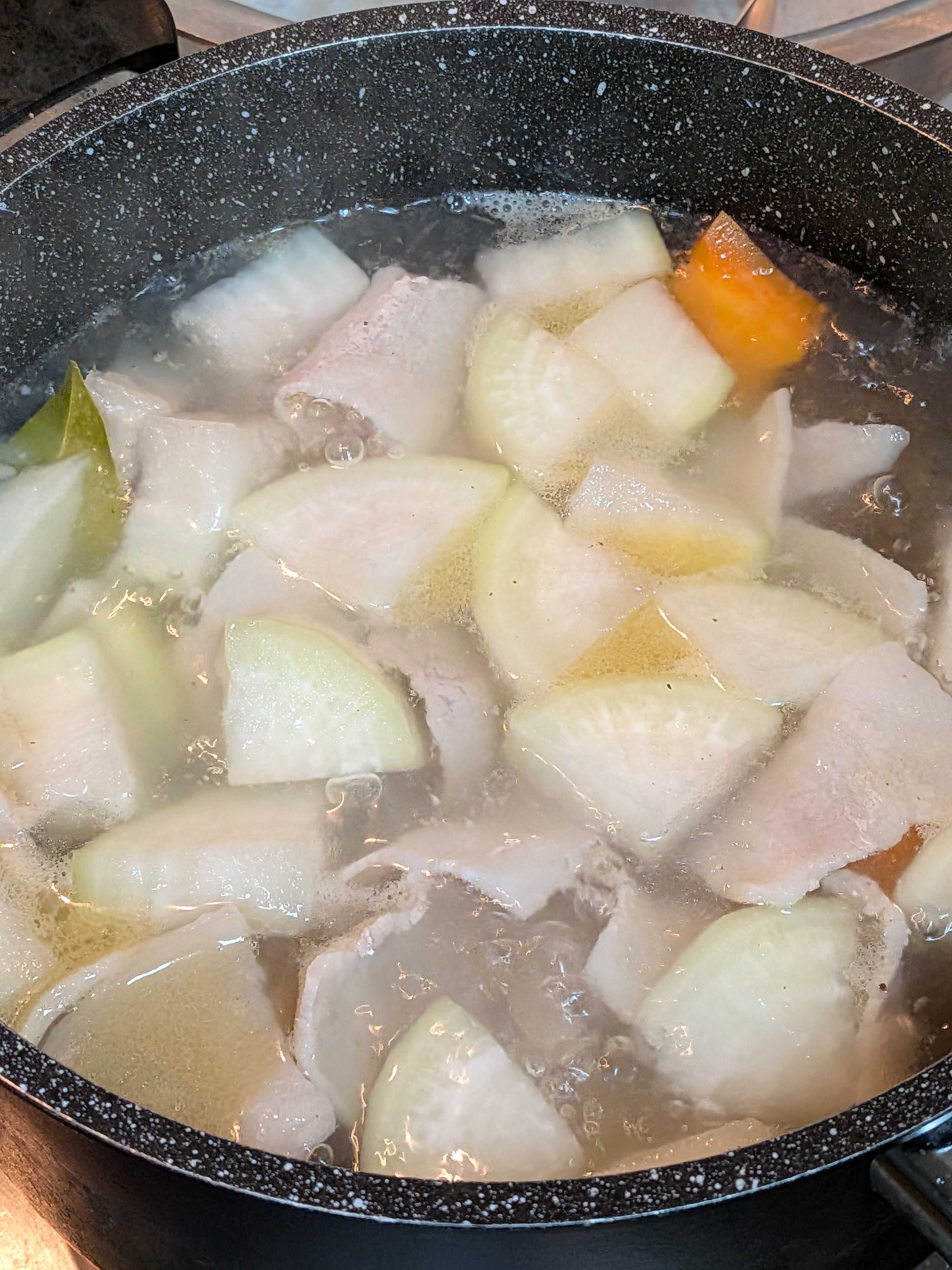 寒〜い冬にはシチュー🍲でしょう 業務スーパーで¥4〜500位🤔だったかも🦆 根菜 新じゃが🥔玉葱🧅人参🥕 今回は大根メインで購入、、、パサパサ😭 ま〜煮りゃ問題無し じゃがいも🥔が7分煮位で、豚肉🐷投入、あくを取ってスープストック完成です✨ 大量玉葱🧅投入 少し玉葱🧅煮たら、半分強スープを取ります。 ホワイトソース投入 味付けは今回、塩数種類、胡椒数種類、ハーブ🌿少々で煮込んでいきます。 業務スーパー激安ホワイトソースで煮込んだ クリームシチュー🍲の完成です✨ 寒〜い冬❄️大根シチュー🍲いかがでしょうか🥰 白菜も美味しいよ〜