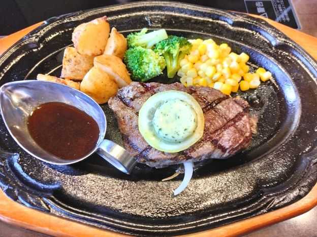 肉の万世で万世ステーキ スタンダード (もも) 120g セット (ライス+とん汁付き) をミディアムレアでいただきました。