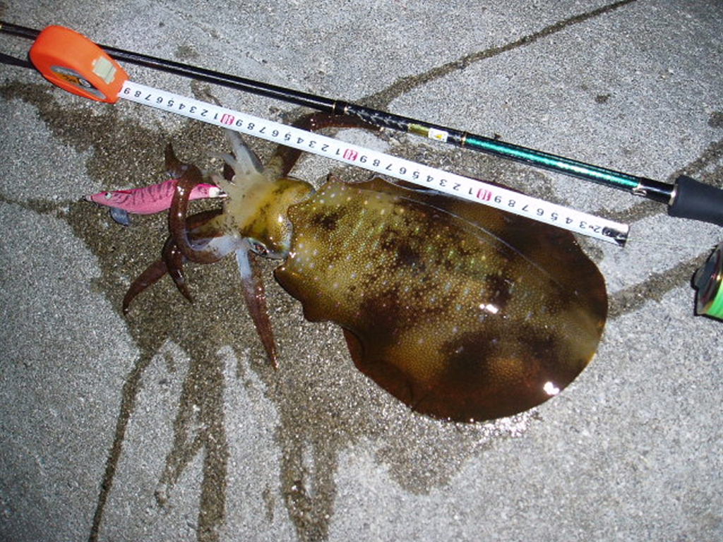 先日、釣具のマルニシ様主催の第1回エギングパーティーに参加してきました!当日は参加者74名、天候晴れ、大潮、6:44満潮で開始がAM5:00でした。まずは受付を済ませ、受付時に抽選をしました。これは、今大会は沖磯で開催されるため、上がる場所を決定するためのものです。オイラは44番。初めてお会いする2人のエギンガーさんと計3人で同じポイントに上がりました。まずはいつもの墨族3.5DEEPを普通に真正面にキャストして様子を・・・・・思った以上の激流が左から右に流れています。さてどうしたものか・・・・2投目は早くもエギチェンジ!エギマルの4.0Fにてフルキャストしました。選択理由はエギマルは良く飛ぶ+Fタイプでサイドのドリフトを試みるため。この2投目で右斜め前に更に沖向きに強い流れがあることに気づきました。3投目は少し右にフルキャストして丁度そのポイントあたりでテンションフォール。流れのためにエギが浮きます。1~2回軽くしゃくってフリーフォール。2回ほど繰り返したときラインに違和感が出たので一気にあわせると、小さいながらにも460gの女の子!男の子をGETしたくて続けてガンガンやってましたがまったく反応なし。10時ごろに渡船屋さんが「水温は14.1度や!くわんな~~!!」といってさっていきました。渋いわけだ。PM1:00納竿で港に帰着。検量を済ませいざ表彰。見事あの小ささで3位(笑)しかーし!同重量の方がいらっしゃって、3位決定戦はジャンケン。・・・・・・・・・・・・・・見事敗退・・・・・・・・・4位になりました(笑)ま、あとはゲストのヤマラッピやタマちゃん、ジョー君のトークショーやくじ引き、ジャンケン大会があり、大盛り上がりで田のしかったっす!次回はぜひジャンケン鍛えたいって来たいと思います(笑)
