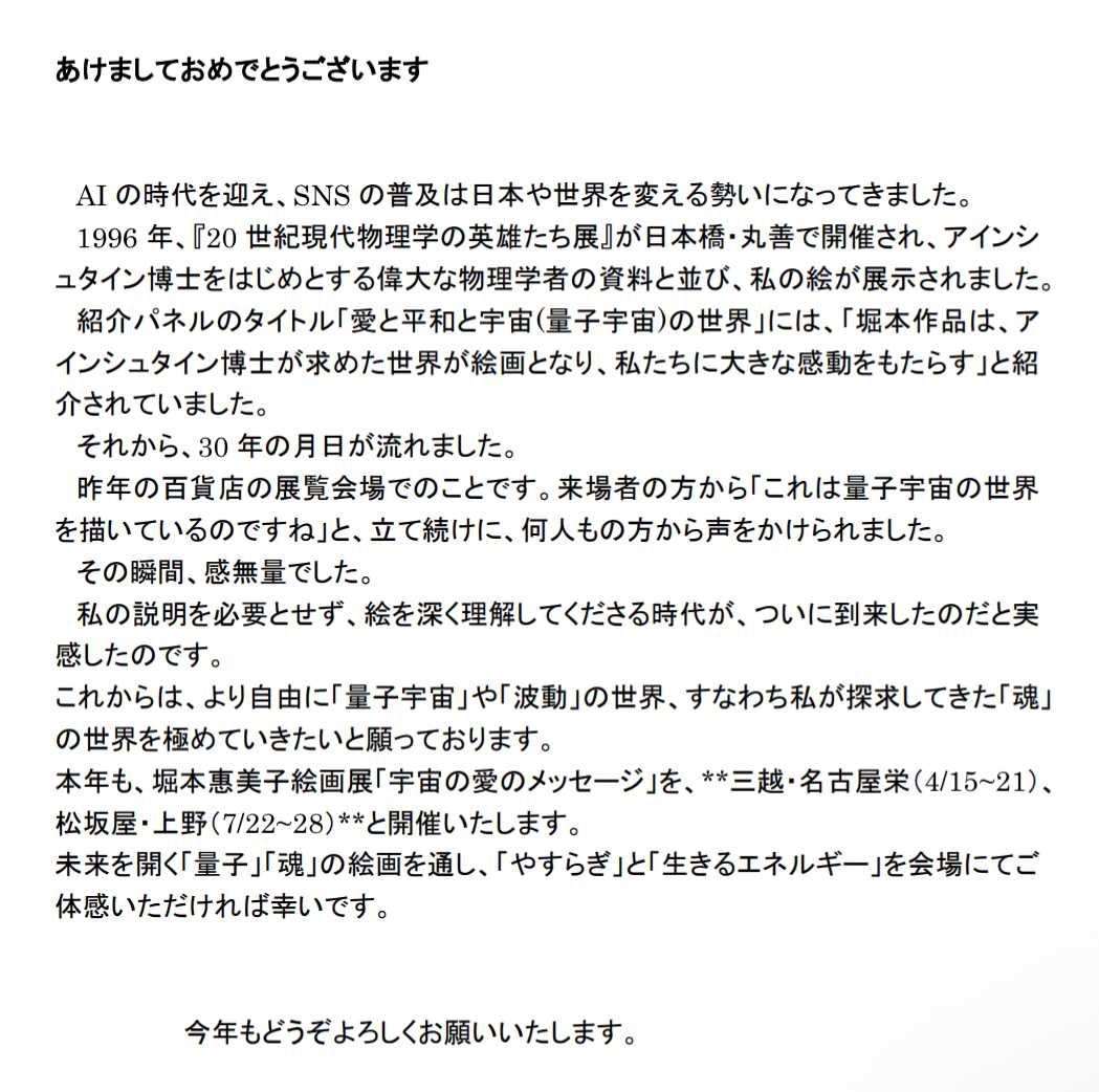 今年の年賀状です。今年もプログを通して皆様と繋がるのを楽しみにしています。 どうぞ宜しくお願い致します。 ![]() 新春小品展 ぎゃらりー由芽・三鷹 2026年1月17日・土曜日から2月1日・日曜日迄 木曜休廊 12時から19時まで 初日オープニングパーティー ![]() CURRENT W・1791 新生 量子宇宙の世界へ 37x24cm 手漉き和紙に水彩・混合技法 ![]() CURRENT W-1792 新生 量子宇宙の世界へ 37x24cm 手漉き和紙に水彩・混合技法 お気に入りの記事を「いいね!」で応援しよう