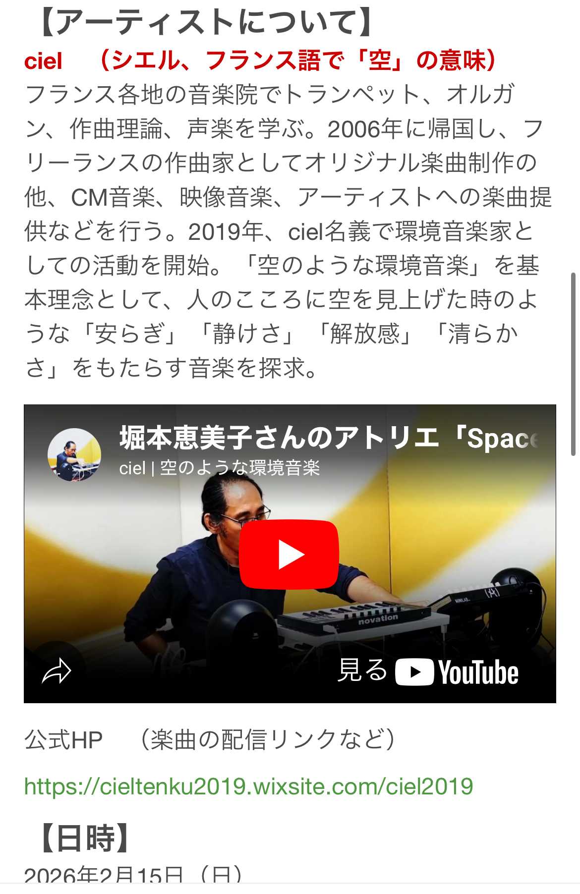 私が今一番関心を持っているシンセサイザーの作曲&演奏家です。 私はCielがアトリエ『スペース青』で演奏してくれた「即興演奏ライブ」の3回のCDを聞きながら毎日作品を描いています。 天上の世界へと誘ってくれるのです。 「Le ciel aucoeur-心に宙をー」 2026年2月15日(日)15:00~16:30頃(開場14:45) 会場:アグリス成城 2F (小田急線「成城学園前」駅西口から徒歩1分 ![]() ![]() チェットのお申込みはこちらから 残り僅か https://ciel20260216.peatix.com/view ![]() 堀本惠美子アトリエ『スペース青』での「即興演奏ライブ」の様子 堀本惠美子の楽天ブログより https://plaza.rakuten.co.jp/emikohorimoto/diary/202409260000/ ![]() ![]() 何時も聴くシンセサイザーとは一味も二味も違う「天上の世界の音楽」を是非聴きにいらしてくださればと思います。 残席僅かです。 ★ 2026年新春小品展 2026年1月17日(土)~2月1日(日)木曜休廊 12:00~19:00(最終日16:00) ぎゃらりー由芽 (東京・三鷹駅南口から6分) 92名の作家の大展覧会です。ぜひどうぞ。 ![]() ![]() CURRENT W-1791 新生 量子宇宙の世界へ 37x24cm 手漉き和紙に水彩・混合技法 ![]() CURRENT W-1792 新生 量子宇宙の世界へ 37x24cm 手漉き和紙に水彩・混合技法 「ぎゃらり由芽のつづき』の会場の様子 ![]() 「ぎゃらり由芽のつづき」 の会場 外からの眺め 正面の右側に堀本惠美子作品が展示されています! ![]() 「ぎゃらりー由芽」の会場入り口 「しだれ梅」が満開に近づいています。 見事です。 ![]() ぎゃらりーオーナーの生け花も見事です。 ![]() 堀本惠美子の個展のご案内 ★ 堀本惠美子絵画展・宇宙の愛のメッセージ 2026年4月15日(水)~21日(火) 三越・名古屋栄 国内外129回目の個展 ★ 堀本惠美子絵画展・宇宙の愛のメッセージ 2026年7月22日(水)~28日(火) 松坂屋・東京上野 国内外130回目の個展 ★ 堀本惠美子絵画展・宇宙の愛のメッセージ 2026年8月26日(水)~9月1日(火) 伊勢丹・新潟 国内外131回目の個展 新潟での7年ぶりの個展が開催されます。 新潟・伊勢丹では初個展です。 ///////// 月刊ギャラリー1月号 ![]() ![]() ・・・・・・・・・・・・・・・・・・・・・・ 【絵の飾り方シリーズ】 #公共施設 #会社 病院シリーズを続けます。 ソウルセラピー 杉並区永福町 ![]() 魂を浄化することで精神的な不調や体調を整えるセラピー施設に展示されています。 多くの人に「やすらぎ」と「生きるエネルギー」を実際に与えているようです。 絵を飾ってあるお部屋の写真1https://plaza.rakuten.co.jp/emikohorimoto/diary/202001230000/ 絵を飾ってあるお部屋の写真2https://plaza.rakuten.co.jp/emikohorimoto/diary/202001190000/ 公共の場の収蔵作品の写真1https://plaza.rakuten.co.jp/emikohorimoto/diary/202001260000/ 公共の場の収蔵作品の写真2 ガラス絵の飾り方 https://plaza.rakuten.co.jp/emikohorimoto/diary/202109100001/ 大きな絵の飾ってあるお部屋の写真https://plaza.rakuten.co.jp/emikohorimoto/diary/202109240000/ 。。。。。。。。。。。。。。 。堀本惠美子の作品の展示の様子新収蔵先 https://plaza.rakuten.co.jp/emikohorimoto/diary/202407240000/https://plaza.rakuten.co.jp/emikohorimoto/diary/202406300000/