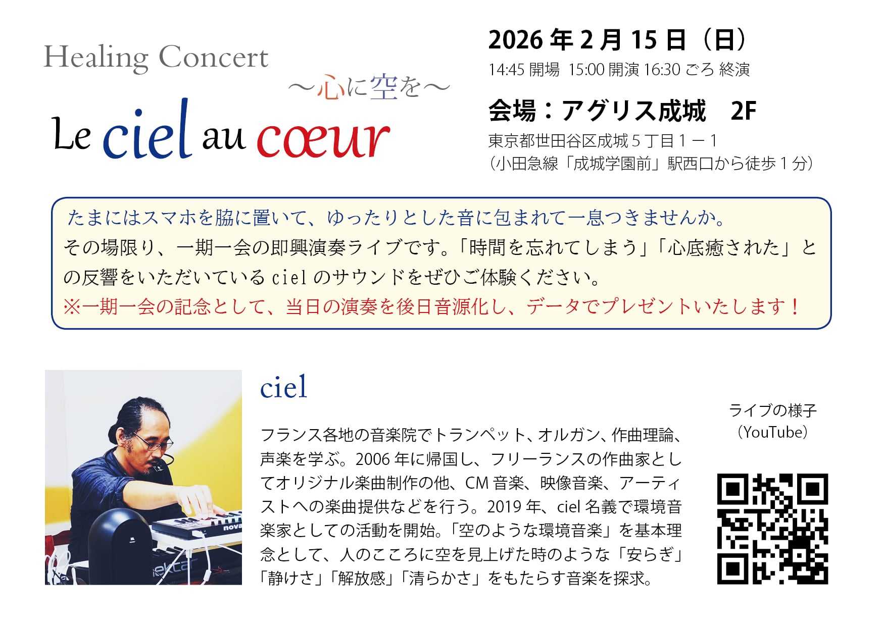 アトリエ『スペース青』で3回ほどシンセサイザーの演奏をしていただいた「Cile」のヒーリング・コンサートが開催されます。