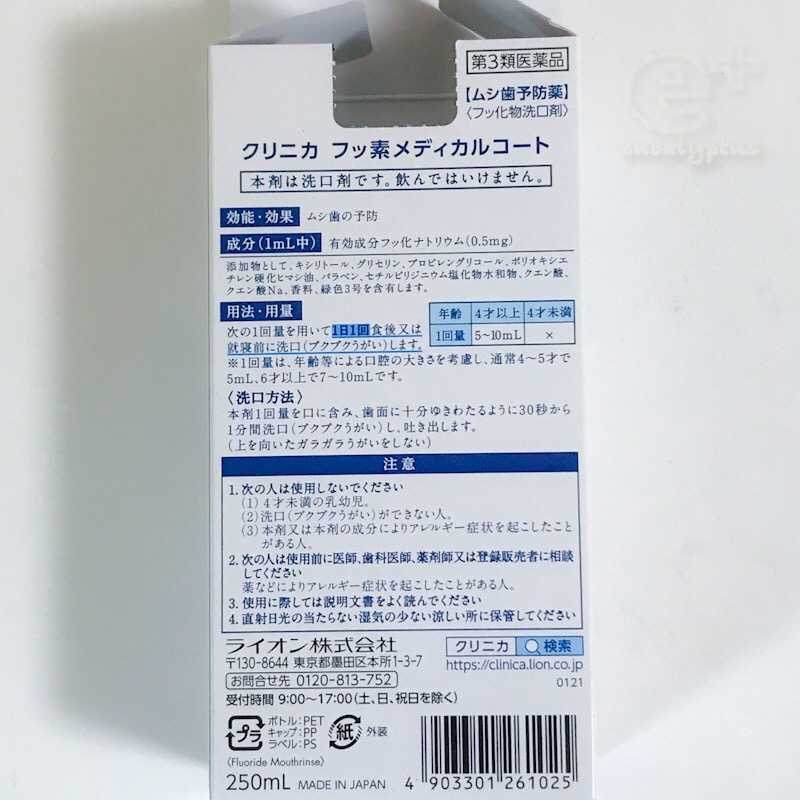 この2〜3年、これを使用してる。 クリニカ フッ素メディカルコート 虫歯予防薬 というもの ![]() 手元のがなくなりそうだったので またポチって補充した。 裏面の説明書きは、こんな(クリックで拡大) ![]() これを口に含んでから歯ブラシすると すっごいツルッツルになるんだよねえ 歯磨き後もまた口に含んでくちゅくちゅして。 すごく気に入ってて 毎日というわけではないけれど、日頃の習慣になっていた。 ・・だけど インプラントしたら、フッ素は控えなきゃならないのかな・・?