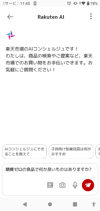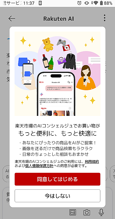 ![]() 検索キーワードに悩まなくても、商品を会話形式で気軽に探せそうです。 スマホ専用アプリです(パソコン非表示)。 実際に試してみました~記事下へ続く。 記事要約 引用元:流通スーパーニュース (2026年1月6日) 楽天news「Rakuten AI」を楽天市場のスマートフォンアプリに搭載 『Rakuten AI』の使い方![]() 楽天市場トップページ右下の「R」アイコンをタップしてみると...。 ![]() 「同意してはじめる」をタップすると...。 ![]() テキスト、画像のほか、音声…会話でAIに相談できるようです。 『Rakuten AI』に聞いてみた「マイクアイコン」をタップして、漠然(ばくぜん)とした質問を話しかけてみました。 ![]() 音声を認識していることをテキストで確認したら「赤いアイコン」をタップ。 音声で解答してくれると思ったら「無言」... テキスト表示でした。 ![]() 説明のあとに、商品(リンク付サムネイル画像)を紹介してくれます。 ![]() 関連する商品の羅列ではなく、「カテゴリ分け」「種類別に整理」されているので、見やすくて探しやすい。 【あとがき】 「音声検索」は従来からありますが、異なる点は、「商品リンク画像」を並べるだけでなく、補足説明があり、種類ごとに整理されていること。 ユーザーの希望を理解しているので、キーワードが一致しても関連性の低い商品は除外しているようです。 いろいろ使ってみると、漠然(ばくぜん)とした要望でも、AIが整理して紹介してくれるので、良いものが見つかることがあります。 下記バナーから入り、「楽天市場トップページ」に移動すると、今回の新しいアイコンがあります。
