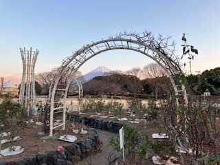 ◆撮影日;2026年01月15日 8:00◆撮影場所;富士市 中央公園 ❤富士山番号:233❤◇薔薇越しの綺麗な富士山と富士ばら会主催の「薔薇講習会」の 様子です。・薔薇の種類に合わせた、枝切り詰め方法。・寒肥の施工方法。・つる薔薇の手入れ方法。(枝の固定、切り詰め等)
