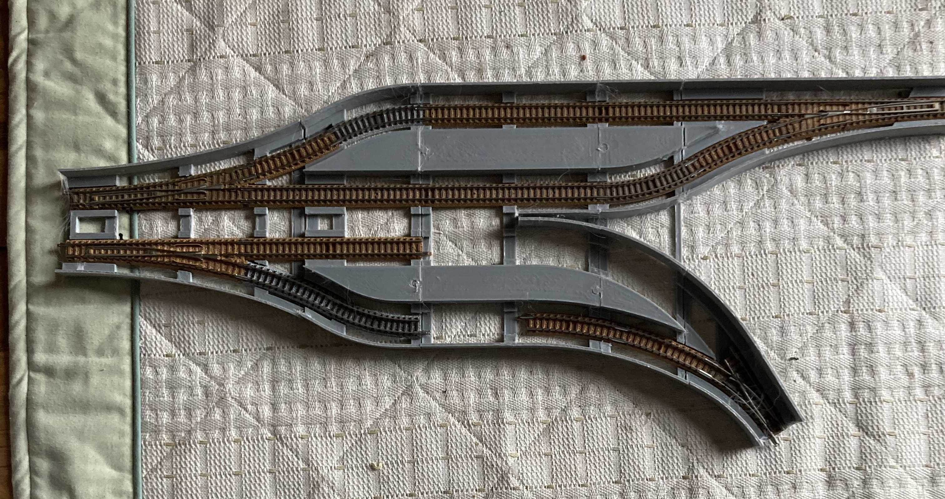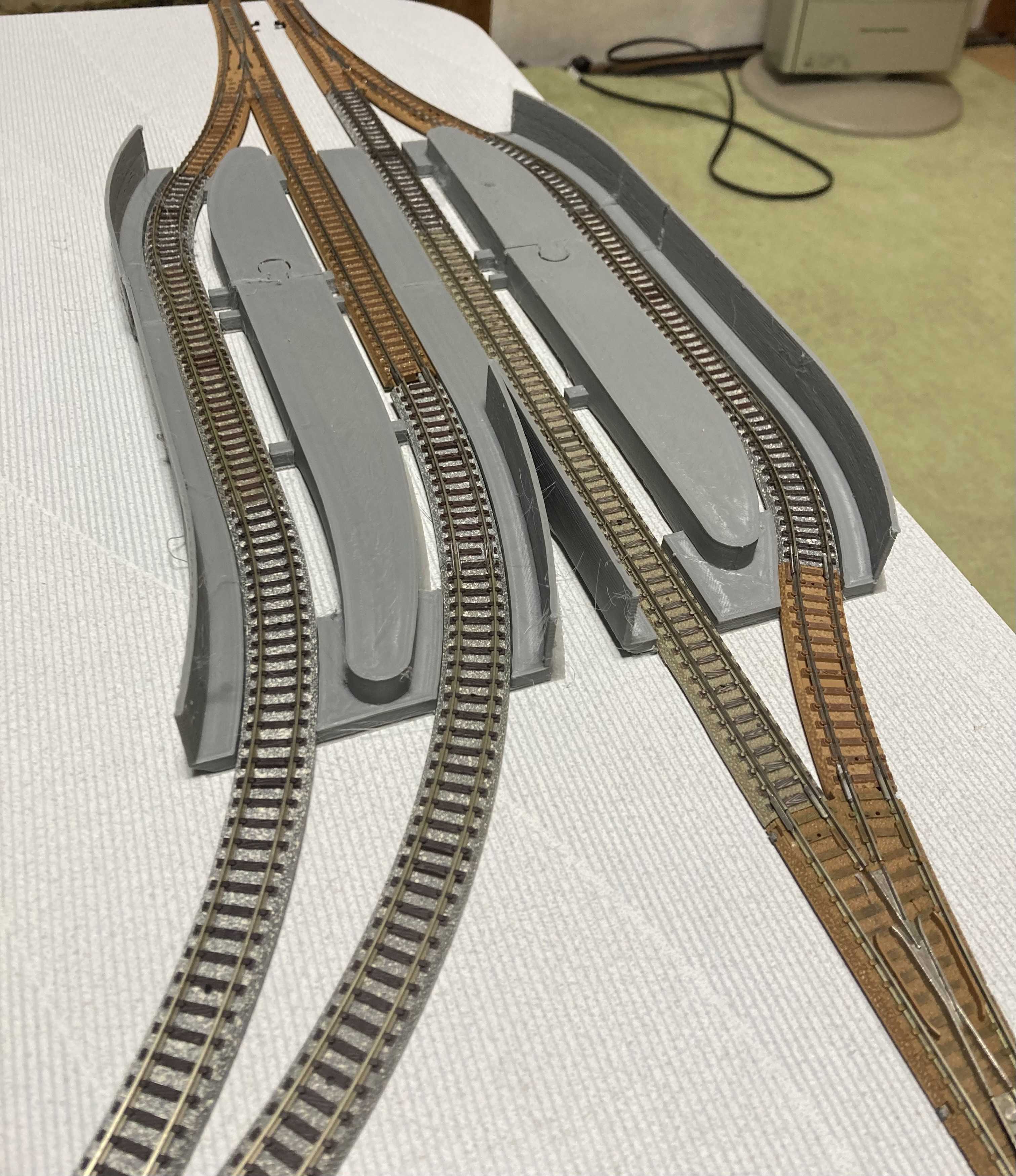 瀬戸大橋について 設計して判ったのは下津井大橋は約1.5kmの吊り橋でNゲージだと10mになるのでデフォルメしてなんぼのネタと割り切ることにしています。 岡山駅について 出張ついでに現地取材して、ソレっぽいものを作ってみました。フル・ハーフ編成も確認してみましたが・・ ちょっと常設するには長いんですよね・・ 悩ましい・・ 新倉敷駅について 早速PC台に間借りして作りましたが結構イケてると思ってます。現地に行ったことない問題が発覚しています。類似駅の福山・相生はアルケドネー。出張の際に足を延ばして取材しようと思ってます。 C177オ折り返し駅について 新幹線を岡山駅と新倉敷駅に駐機させたとしてMAX4編成になるのですが僕の記憶からして常時駐機が許されるのは岡山始発・新大阪駅行きの1編成ダケだろ?と思ったりするので新大阪か博多を・・・って何度か行った事あるけど印象がない・・・そういった風味の駅を作ろうかと思っています。 岡山操車場について ホームに駐機させるより操車場に並べた方が良くね?と思っているのですが高低差180mmを下るループ橋脚を真面目に考えるのは当分先ですね~っと。 2026年3月29日 駅ホーム3種 いままでイロイロと検討してきましたが、我が家のレイアウトスペースとBトレインショーティ5両だとノーズがオーバーするサイズで考えて「駅ホームの長さ」を320~350近辺にすることを決めました。あとフリマでの入手性からP?541ポイントの積極利用といったトコも加味して”とりあえず停車感を確認する為に”3種類作ってみました。P?140の利点は140mm程短くなる程度なので利点の多い仕様で考えていきます。 まずは岡山駅の上下線島式ホームです。 ![]() 次は新倉敷駅のこだま停車駅スタイルです。 ![]() そして最後はC177折り返し駅スタイル、、、、 昇降階段が無いだけで結構物足りなくなるのにはビックリといった感じです。 実はレイアウトでマダ納得していないです。C177で折り返すレイアウト仕様なのでその幅が必要なのは確定しているので、C177の内周を活かして2路線通過+4路線停車に拡張して博多のロングホームスタイルだと言い張るのも良さそうです。写真に撮って気づいたのですが、C177に加えて島式ホームの1路線分膨らんでますね。 ![]() ※じつはTOMIXもKATO共にトングレール部で問題の抱える車両(台数と原因が何種類もある)が脱線しやすいので頭を抱えていましたが、TOIMIXの旧仕様ポイントで結構我慢できる程度だと気づきました。その中で良いだろうなと期待しているのがBACHMANNのポイントでチマチマと買い足しています。(問題があるから脱線するのか?脱線するから問題になるのかは良く判っていません。 C177の折り返しに少しでも寄せられないかということで再作成しなおしました。上下のホーム幅が違いますが、前回に比べて140mmほど近づける事に成功しました。このホームを眺めていると中央のC140カーブとC280カーブをポイント化に加えて、両渡りポイントも追加すると更に2編成停まれるんじゃね?って思った。一応310mm程度の駅ホームで十分カナーといった感じです。 ![]() 2026年2月19日 複線の橋? 下津井瀬戸大橋モドキを複線で作ってるのにループ線はなんで単線なん?という素朴なツッコミが痛い・・ という訳で複線タイプをお試し作成しています。 ![]() ![]() ![]() 僕は組み立てが面倒クサいので部品は橋脚と足の2点しかありません。3x3の角支柱2本で立ってるのですが反ってるので太らせる必要があります。何本ものレールを載せれてるので強度的には大丈夫カナ?と思ったのですが、180mm駆け上がる為に45°曲線レールが56本必要とかバカじゃねぇの?ってぐらい必要で、登って降りるには112本必要とか凶悪仕様になっています。 ![]() ![]() 組んでみました。強度的にはバッチリですが僕の手持ちレールを総動員しないと成り立たない凶悪仕様でした。レール接合部に橋脚を合わせたり複数段作ることでレール同士がスッポ抜ける問題も起きにくい様です。あと、バリ、ヒケは手入れしないとパンタグラフに引っ掛けてしまうことが判りました。(迂闊よねー 2026年2月 ネオ新倉敷駅(仮) HomeAssisrantのデバイス作りの小休止として新倉敷駅風味を作ってみました。まぁ新倉敷駅の新幹線ホームは使った記憶が無いので、福山か相生風味かなぁ。 ![]() ![]() 180mm高架がハマった感じでディスプレイ下側に駅ホームを押し込めました。奥側の上り線が真っ暗でレールスターが見えない・・ ので今後照明を付けます。あと、、 収まり具合を考えるとやっぱり4両編成用ホームが正義ナンダヨね。 2026年1月岡山駅新幹線ホーム 先日作成した上下線用の新幹線プラットホームがどうも仮設駅にしか見えない。などと思ったら京都への出張が入りました。 うん、、悪ふざけいきます。 ![]() ![]() ![]() ![]() 他にも色々撮りましたが、、、 駐機中のN700が邪魔だから退けて欲しいww写真撮って気づいたのは屋根の支柱が中側に寄った場所に立ってる事かな?車両の長さに合わせた等間隔で