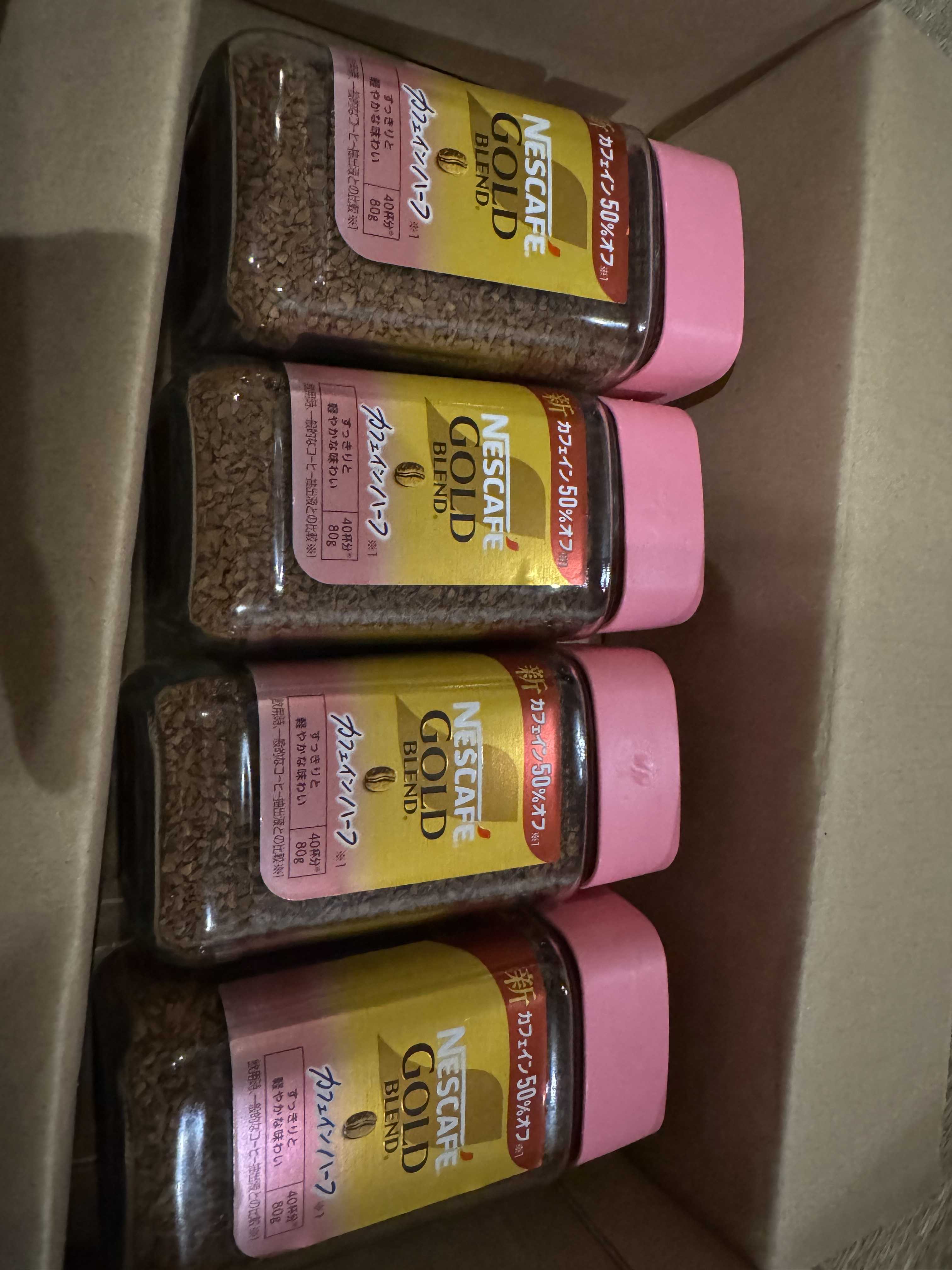 インスタントで1番美味しいと思ってるネスカフェコールドブレンドのピンクの蓋のはカフェインハーフ。私はブラックコーヒーでよく気分が悪くなるのでこれだと毎日飲めます。飲み終わった後カップの底を見るとドリップした時のコーヒー豆の挽き粉が残っているのでインスタントコーヒーじゃないみたいです。香りもいいしお手軽なので何本もリピートしてます。