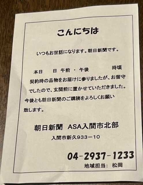 朝日新聞の契約時の品物(景品)の洗濯洗剤を、「お留守でしたので、玄関前に置かせていただきました」とのこと。