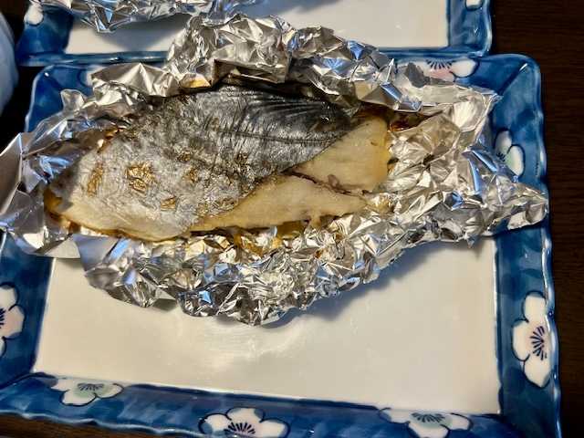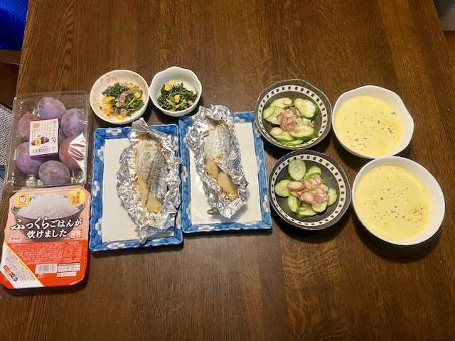 夕食は、さわら西京焼き(柚子味噌漬け)、ほうれん草・ベーコン・コーンのソテー、胡瓜・茗荷、かぼちゃのポタージュ・胡椒、生プルーン、ご飯。