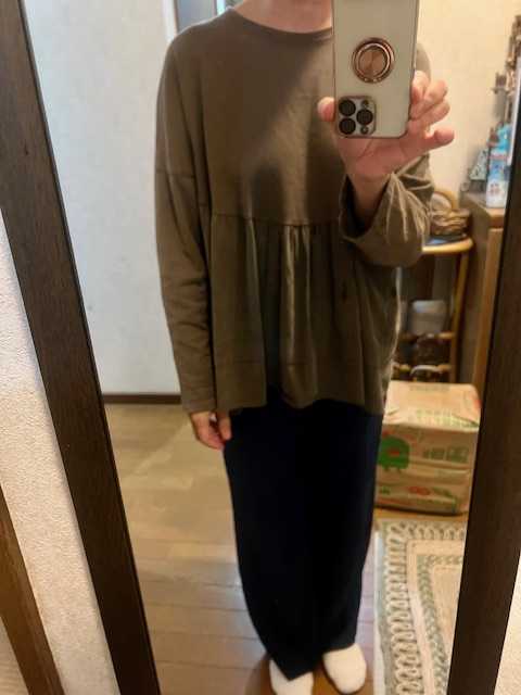 茶の裾ギャザーチュニック、紺のパンツ、白・青の靴下、黒の紐靴。