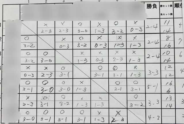 3・4位も3勝3敗。Kさん・Mさんは、得失点差では4位だけど、勝ち数が多いので3位になっていた。
