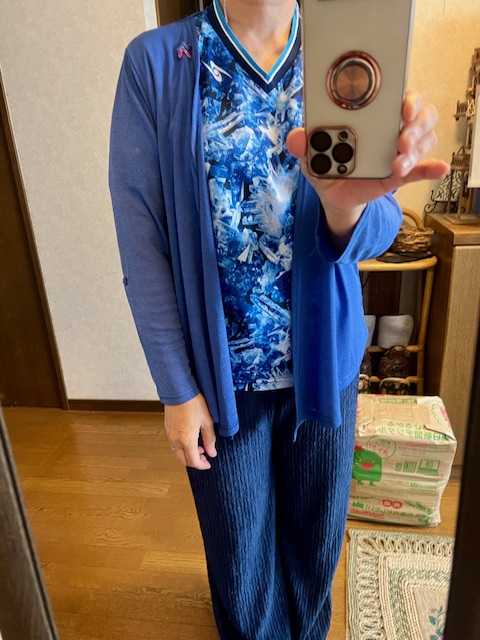 2025年09月20日XML 黒レースの5分袖インナー、茶・焦茶の花柄ワンピース、ベビーピンクの靴下、ベージュのサンダル。卓球には、ピンク・白の卓球Tシャツ、黒・ピンクのスコート、黒の股関節スパッツ、白・ピンクの靴下、黒のスリッポン。上に、青のカーディガン、紺のプリーツパンツ。