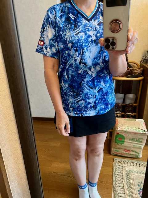 卓球には、紺・青・白の卓球ユニフォーム、黒・青のスコート、黒の股関節スパッツ、白・青の靴下、黒の紐靴。