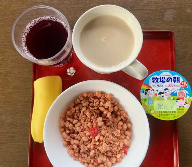 朝食は、ごろグラ・いちごづくし・完熟いちご仕立て、バナナ、ヨーグルト、カフェオレ、グレープジュース。