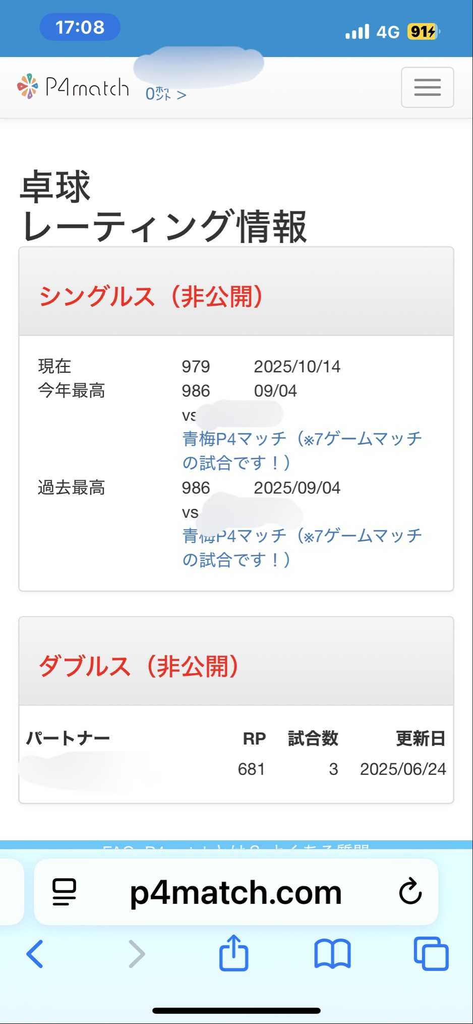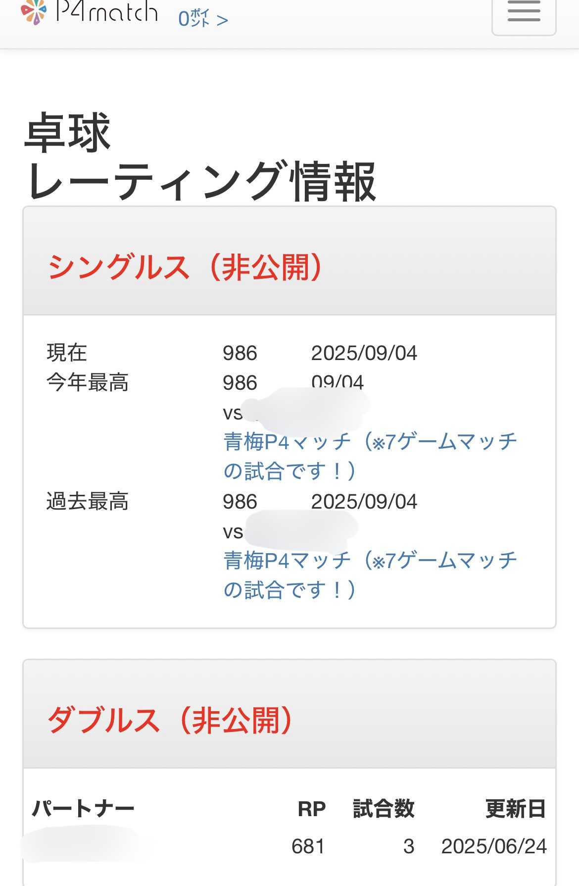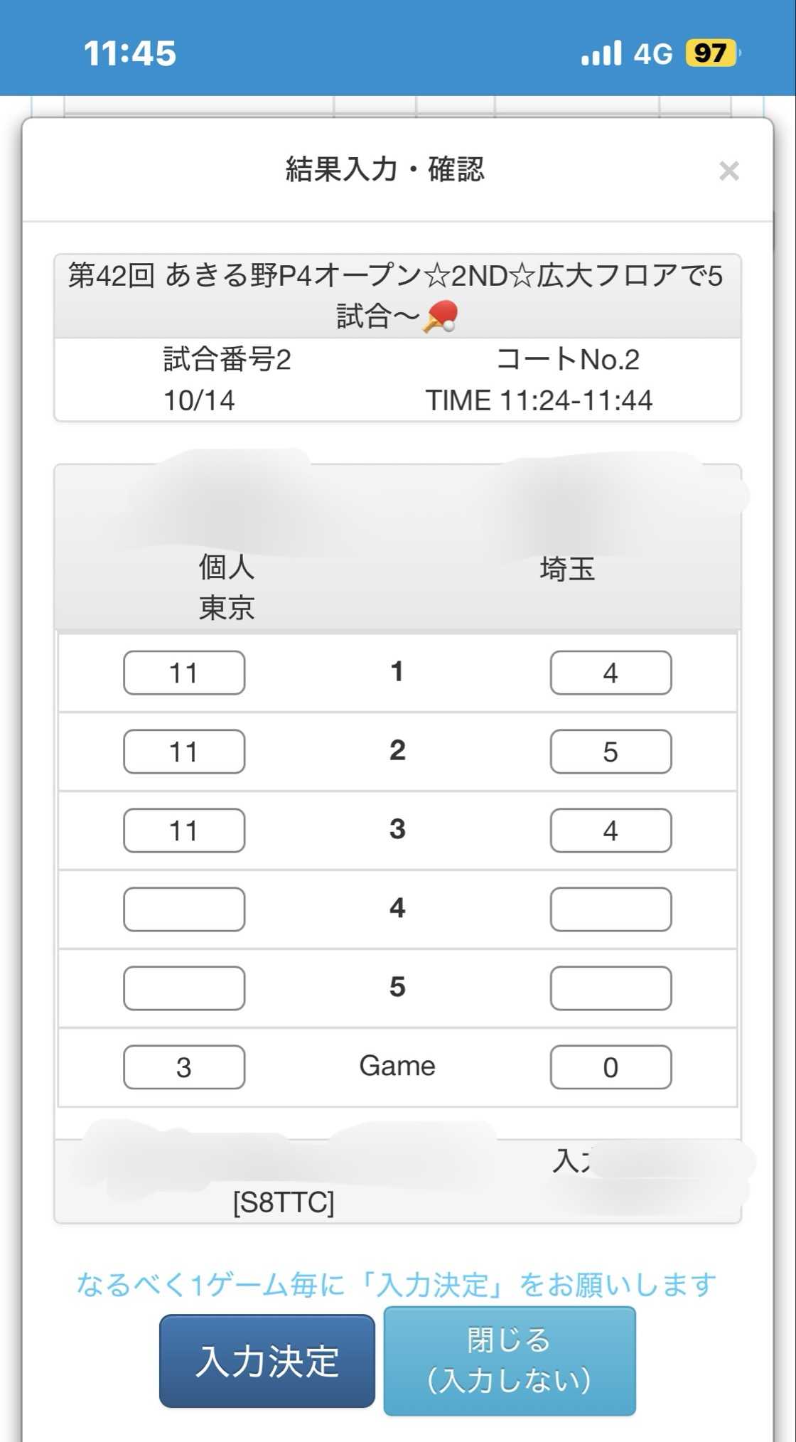 3-0 HTさん 裏表 11-4 12-10 11-8 横上・横下・ショートサーブが効いた。ジュース取り切れて良かった。HTさんも前よりフォアで打ってくる。ブロックなどでなんとか返球した。)