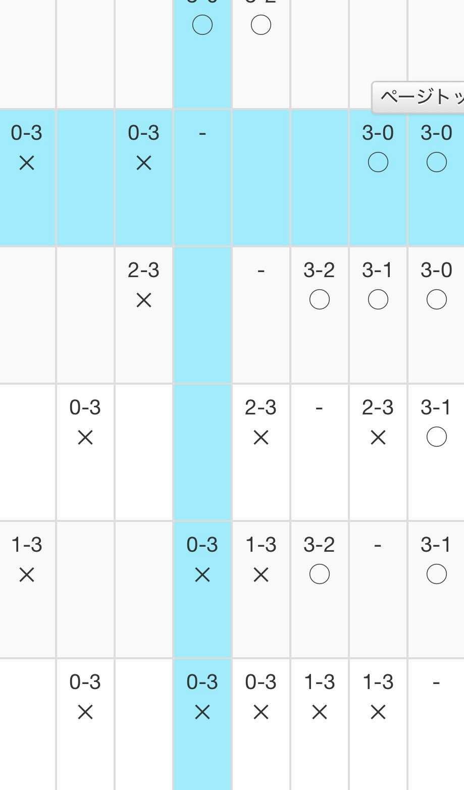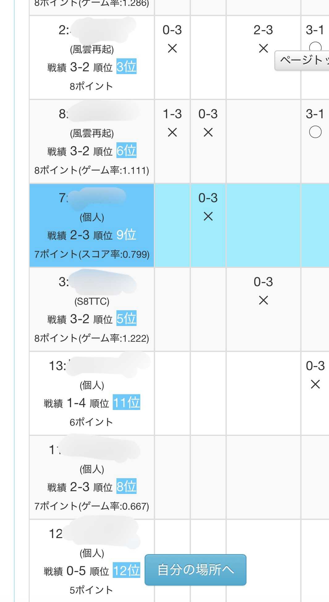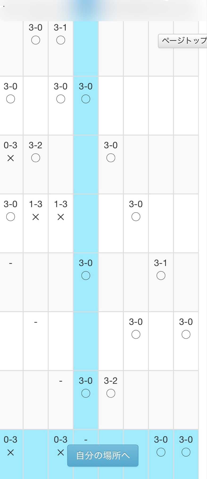 0-3 ITさん(男子)(個人)裏裏 1位 4-11 5-11 4-11 左右に振り、浮いた球を打とうと焦るとミスしてしまう。横上・横下・巻き込み・バズーカサーブもほとんど効かない。ショートサーブの3球目もオーバーしてしまった。あまり速くないドライブで来るので、伏せてブロックしていたが、ナックルの時もあって、ネットミスしてしまった。
