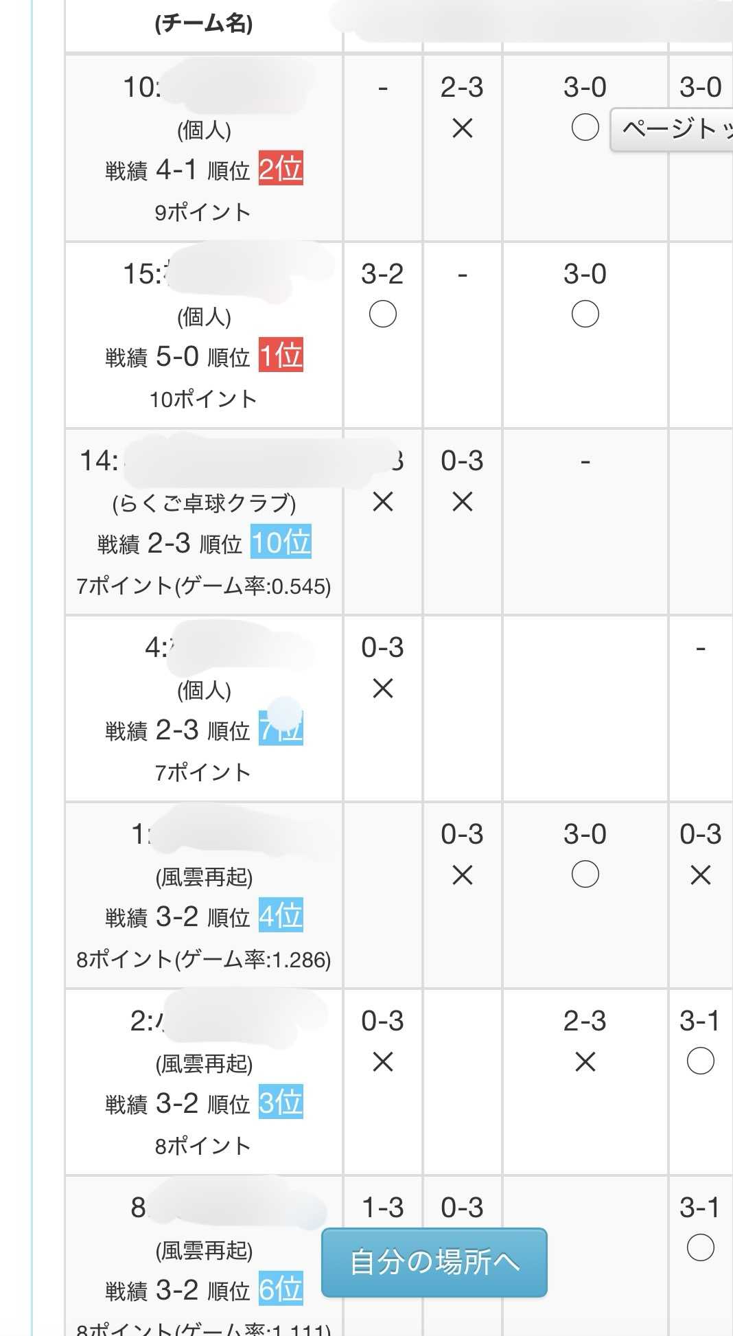 UMさん(5位・女子)とは対戦が無かった。以前は勝ったが、 今は裏から表に変えたらしい。表でスマッシュしてくるから、対戦したら、勝てるかどうかはわからない。