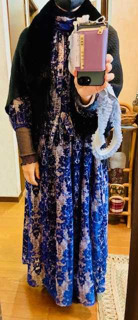 紺ラメインナー、紺・ベージュのワンピース、黒レースぺチパンツ、黒靴下、銀・黒スニーカーブーツ。
