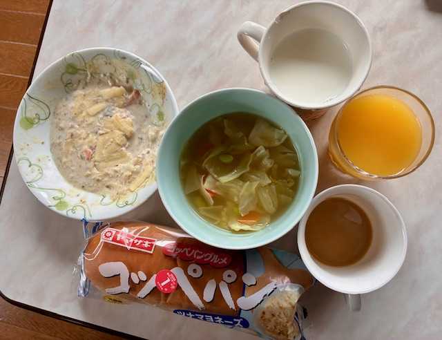 朝食は、コッペパン・ツナマヨネーズ、海老ドリア、団子・キャベツ・人参・枝豆のコンソメスープ、りんごの皮・レモン煮。コーヒー、牛乳、ピンクグレーフルーツジュース。