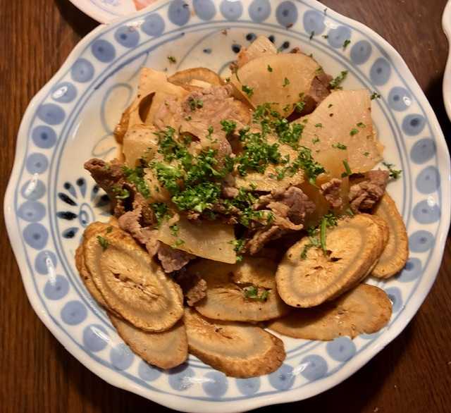 夕食は、牛・蓮根・大根・牛蒡炒め・パセリ、ベーコンエッグ・粉チーズ・胡椒・醤油、ミニトマト・アスパラ・サニーレタスサラダ、ほうれん草の味噌汁、アメリカ産ぶどう。