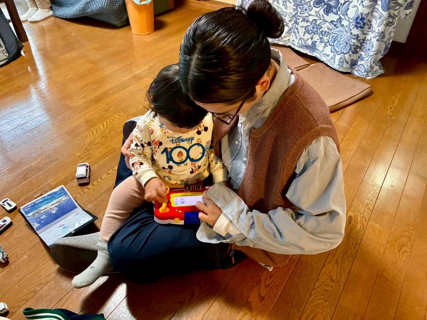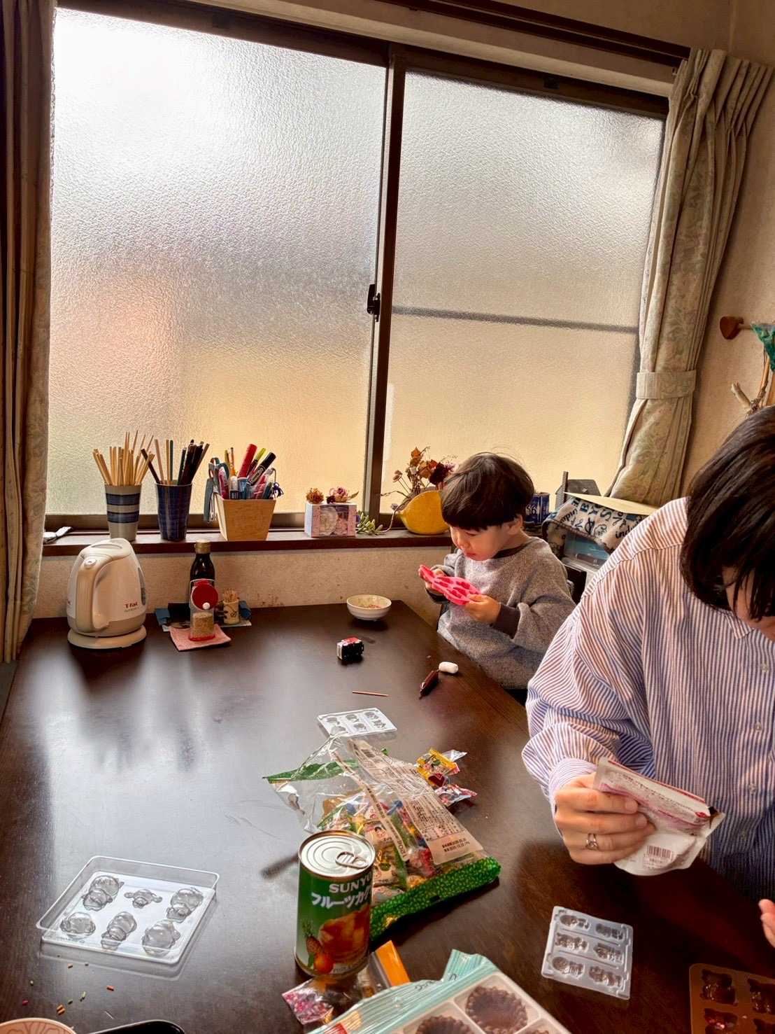 今日のコーディネートは、茶・黒・紫系。 紫のタートル、黒のジャンバースカート、茶のショートカーディガン、黒スパッツ、茶の靴下、銀・黒のスニーカーブーツ。 ![]() 茶のカチューシャ。 ![]() 朝食は、クロワッサン、胡瓜・サニーレタスサラダ・ごま油&ガーリックドレッシング、納豆・春菊・もやし・人参の味噌汁、牛乳、オレンジジュース。 ![]() おやつは、バナナ、コーヒー。 ![]() ![]() 長女と孫娘・次女と孫息子達・息子が帰省。 横浜在住の長女が、昼食に横浜のソウルフード!崎陽軒のシウマイ弁当を 私と夫の分まで買ってきてくれました。 自分達の昼食を買ってきてと、それぞれに言ってあるのですが、 私が駅まで迎えに行き、その帰りがけにお互いの昼食をスーパー・ヤオコーで買おうと言ってたので、 横浜で崎陽軒のシウマイ弁当を3人分買い、バスで来てくれました。 来る予定の時間より早目に着たので、焦ってしまってたのですよねw 助かりました。 ![]() 長女・孫娘、私、夫の分のシウマイ弁当。 ![]() 夕食などにと、焼売も2箱買ってきてくれました。 夕食は用意していた材料で足りたので、一箱、日帰りする息子にお土産として持ち帰ってもらいました。 孫たちと作ったバレンタインチョコもねw ![]() 長女と孫娘。アナ雪のアナのドレスを着てきてくれました。 ![]() 先日、長女と孫娘Hちゃんが作ったというチョコも持ってきて、食べさせてくれました。 ![]() ![]() また、先日行ったディズニーランドのお土産。 2026年02月12日XML 長女が孫娘とディズニーランド。ミニーのファンタジーランドの水玉カーペットで撮影した写真などをLINEで送ってくれた。 ![]() ![]() ![]() うちの、そのまんましらすせいべいも食べてました。フィッシュ&アーモンドや、酢昆布、みかんなど。 ![]() 次女・孫息子達も到着。マクドナルドのハッピーセットを3袋、チキンナゲットも買ってきた。 ![]() 男の子用2つ、女の子用1つ買ってきてくれて、女の子用のおまけはHちゃんにくれました。 ![]() ![]() ![]() ![]() ![]() チキンナゲット好きの次男Tちゃんw ![]() 左から次女、長女、夫。 ![]() 左から、次女の長男T君4歳、長女の娘Hちゃん2歳、次女の次男Tちゃん3歳。並んでます。 ![]() ![]() ![]() 昼食は崎陽軒のシウマイ弁当、ウィンナー・玉ねぎのかき玉汁。 ![]() 息子も少し遅れて到着。孫達が大歓迎! 遊んでくれるお兄さんポジションなのですよねw ![]() ![]() なぜか偶然、崎陽軒の幕の内弁当を買ってきてました。 みんな、代金は私がPayPayなどで支払いました。昼食をこちらで用意するより合理的w 実家の母譲りの知恵です。母もそういうところは合理的で良かったなあw 母は孫達をあまり怒ったりしなかったけど、それでも怖いオーラはあったそうw 私は子ども達にも怖いと思われてないから、孫達にもそう思われたりしないだろうなあw ![]() 食後、キーボードを3人で演奏!?w ただ叩くだけですがw ![]() ![]() 大きな輪も遊び道具w ![]() 息子が崎陽軒の幕の内弁当の焼売に、辛子を輪にした中に醤油を垂らしてた。YouTubeで見たそうです。 ![]() ![]() 私と夫の誕生日が2月20日と24日なので、息子が誕生日プレゼントに、 地球の歩き方の東京・多摩地域と埼玉を買ってきてくれた。 ![]() 入浴剤も。嬉しいですね。長女・次女はバレンタインデーということで、すっかり忘れてたらしいw ![]() ![]() ![]() ![]() 孫たちがバレンタインチョコ作りしました。 袋ごと湯煎するチョコ(茶・ピンク・白)、チョコクランチ、 マシュマロ、型、タルト(バニラ・チョコ)、トッピング、チョコペンなど用意しておきました。 みんな楽しんでくれてよかった。トッピングをつまみ食いしたり、 型に入れてまだ固まってないチョコを舐めたりと、いたずらしてたけどねw ![]() ![]() ![]() ![]() ![]() ![]() ![]() ![]() ![]() 得意げなT君。 ![]() ![]() ![]() Tちゃんが静かだと思ったら、トッピングやマシュマロを食べてました。 ![]() ![]() ![]() ![]() ![]() ![]() ![]() Hちゃんが、息子と一緒にピンクのチョコを型に入れてたら、 入れ過ぎてしまい、みんなが思わずアッ!と言ってしまった。 ![]() Hちゃんは、失敗したと思ったのか、長女に抱っこ!と言ってリタイア。 ![]() 後は息子が引き継いでいました。 ![]() ![]() ![]() Hちゃんも無事復活! ![]() ![]() ![]() ![]() ![]() ![]() 先日、Hちゃんと長女が作ったチョコ。 T君やTちゃんに食べてもらっていました。 ![]() ![]() ![]() トッピングのミニマシュマロだけつまんで食べてるT君。 ![]() 型に入れたチョコは、冷蔵庫に入れました。 ![]() 作り終わって、ホッとしてたら、麦茶のポットを次女の次男のTちゃんが倒してこぼし、 次女のパンツ、テーブルの上、床など、ずぶ濡れになり、雑巾だけでは足りず、タオルを何枚も使用。 まあ、おかげで、テーブルも床も綺麗に拭き取ったので、綺麗になりましたねw。 軽くゆすいでから、洗濯機とガス乾燥機に入れたので、割とすぐに乾きました。 型に入れたチョコも固まったので、持ち帰り用に小袋に分けました。 テーブルの下に入り込