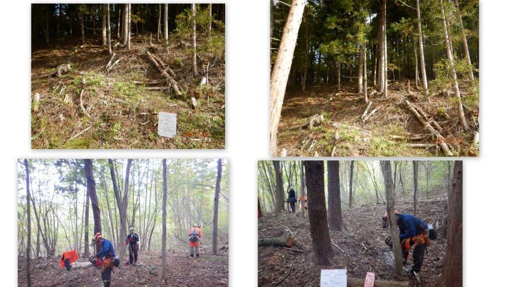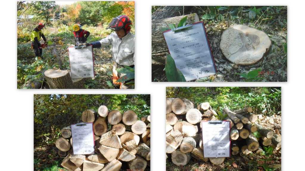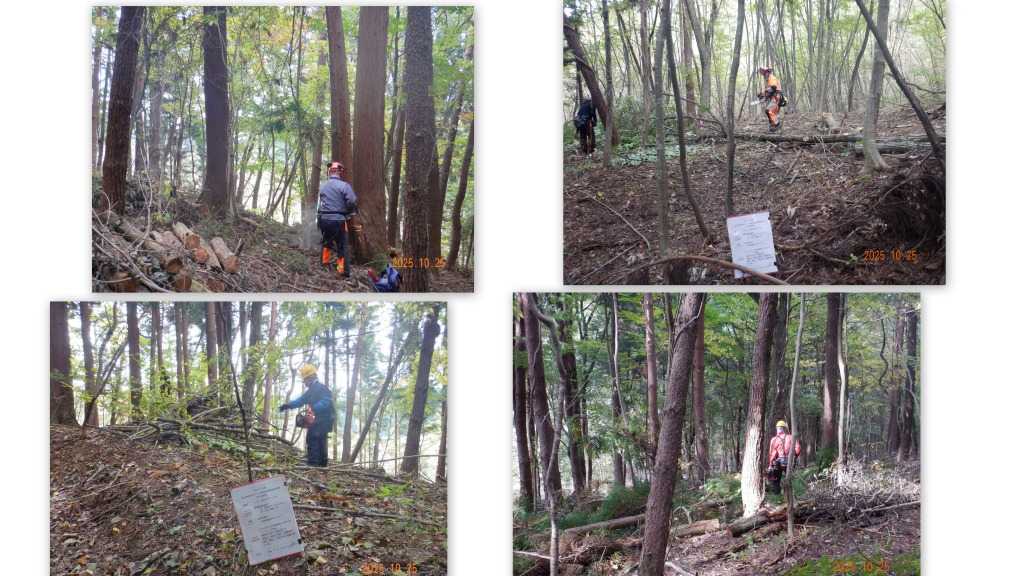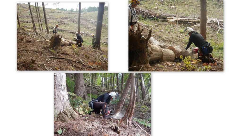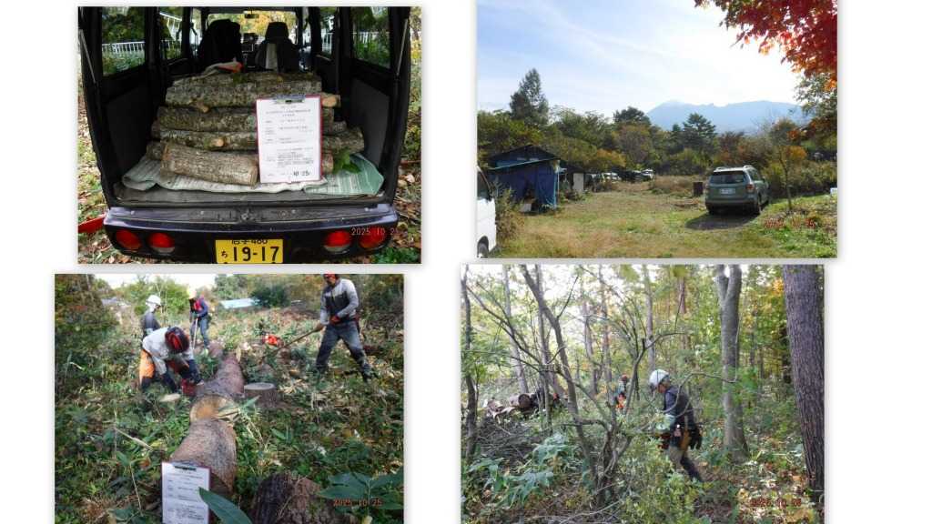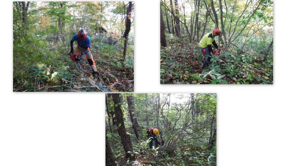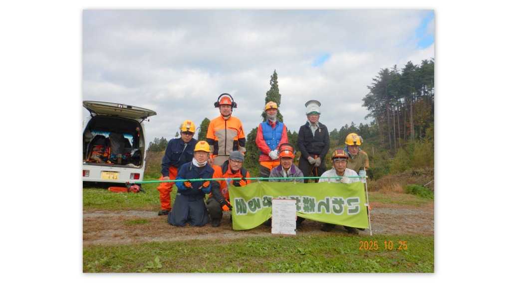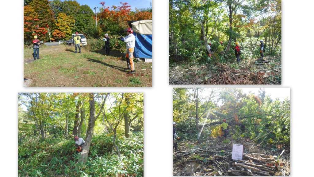 10月25日(土)10月第2回目の活動が行われ北グループは八幡平市、南グループは紫波町で(北5名、南9名の計14名)が参加しました. 北グループの活動は午前中は楢の木を伐倒し玉切り、薪材として搬出しました.午後からは以前伐倒玉切りした赤松等の集積と周辺の雑草木の刈り払いを行いました. 八幡平は朝は3℃と冷え込みましたが間もなく日が差し暖かくなりました。 南グループの活動は枯損木、変形木等の伐木を実施しました. 最近話題のクマについてですが、午後作業の山に来た人がいたので話をしたら、元森林監視員とのことで我々の作業した山の左側に熊3頭、右側に2頭いるとの事でしたが、遭遇はしませんでしたが、山道には熊の足跡がありました。十分注意して作業をする必要があります. 次回は、11月9日(日)北グループは八幡平市、南グループは紫波町です. 北グループ 南グループ
