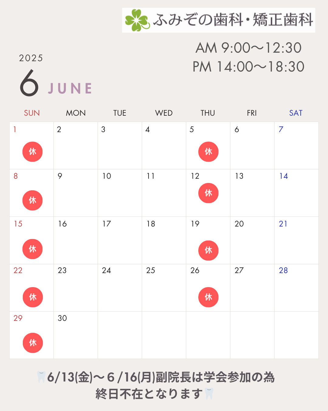 🐸2025年6月休診日のお知らせ🐸明日から6月スタートです!ジメジメ梅雨の時期になりますが、お口の中はスッキリ綺麗でいたいですね🦷✨6/13(金)〜6/16(月)の期間、副院長は学会参加の為、終日不在となります。一般歯科は予防処置のみとなりますので、よろしくお願いいたします。🙇🏻♂️6月もよろしくお願いいたします!✨